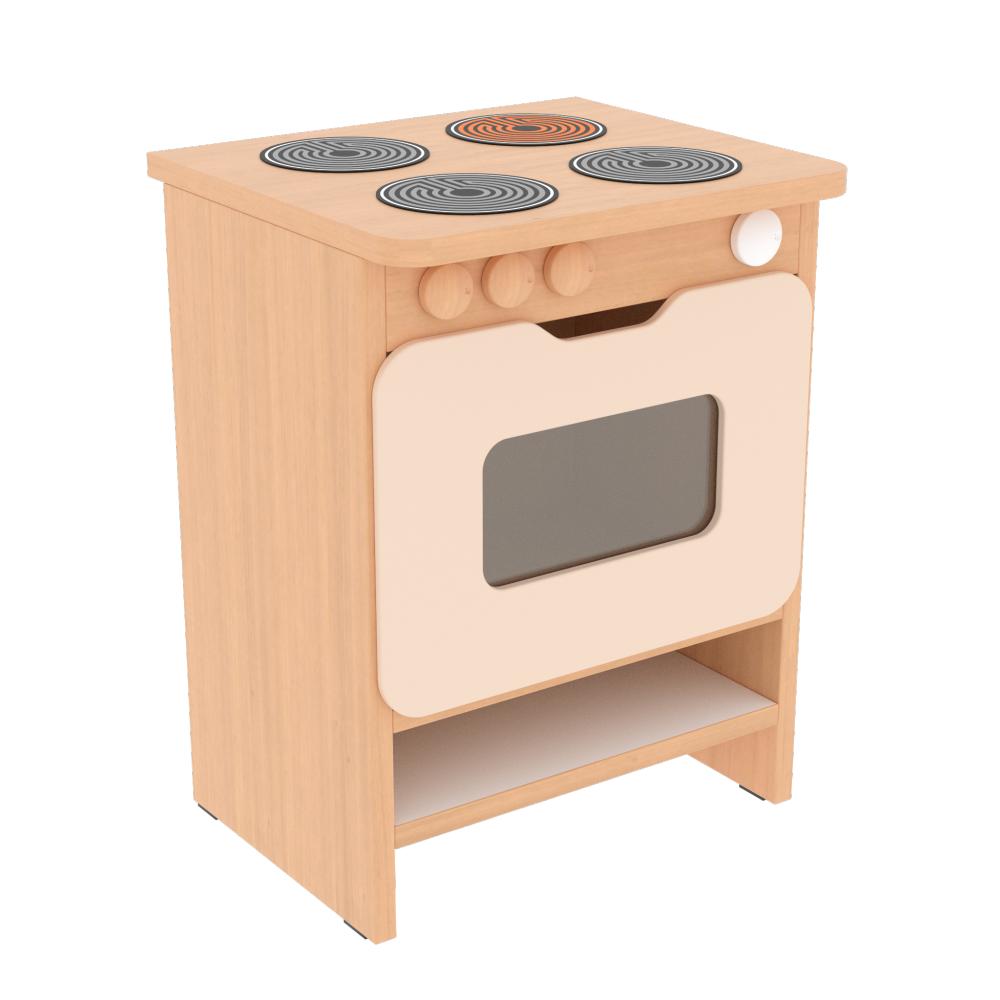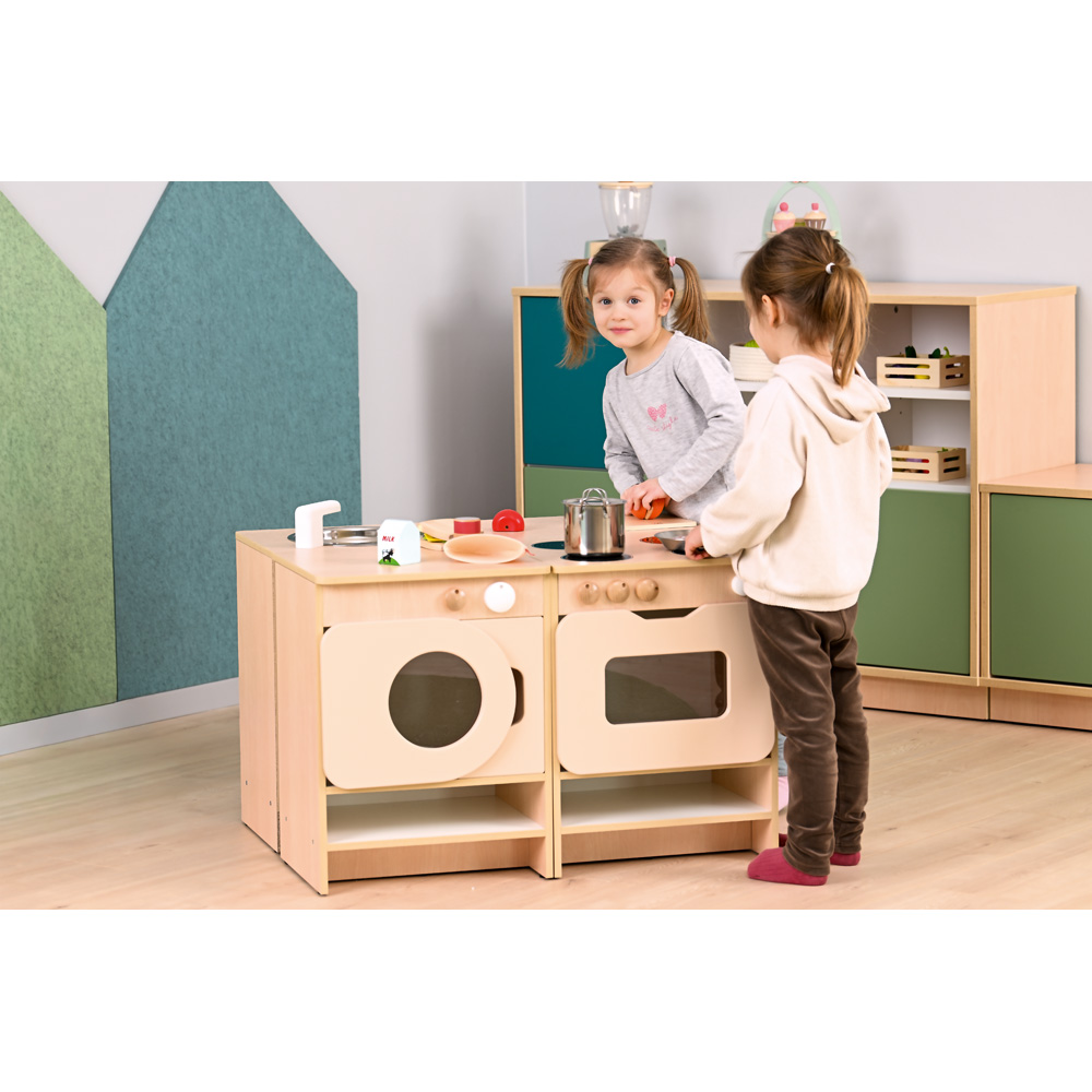 Die farbenfrohe Küche bildet eine Spielkulisse für Rollenspiele und umfasst 8 Module (Herd, Spüle, Schubladenschrank, Waschmaschine, Kühlschrank, Regalschrank, Eckschrank und Eckregal). Die Möbel sind aus laminierter Spanplatte (12 mm) in Ahorn-Optik oder weiss, Fronten aus farbiger MDF‑Platte gefertigt.