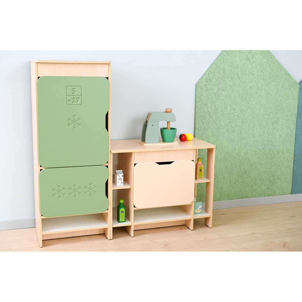 Die farbenfrohe Küche bildet eine Spielkulisse für Rollenspiele und umfasst 8 Module (Herd, Spüle, Schubladenschrank, Waschmaschine, Kühlschrank, Regalschrank, Eckschrank und Eckregal). Die Möbel sind aus laminierter Spanplatte (12 mm) in Ahorn-Optik oder weiss, Fronten aus farbiger MDF‑Platte gefertigt.