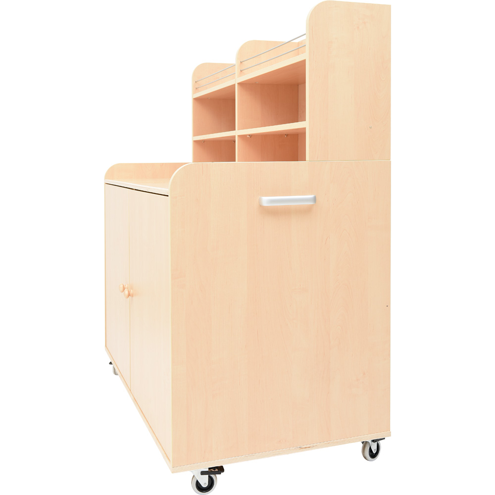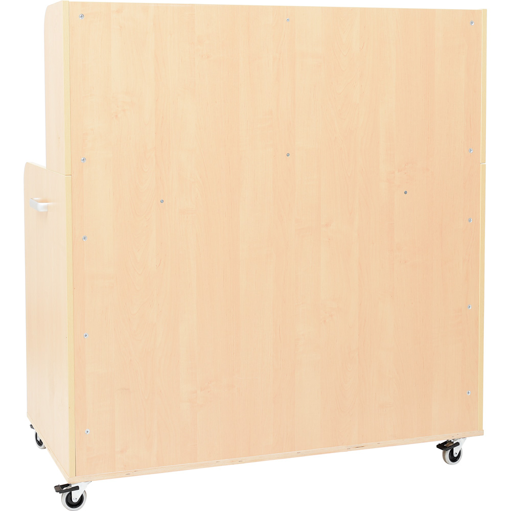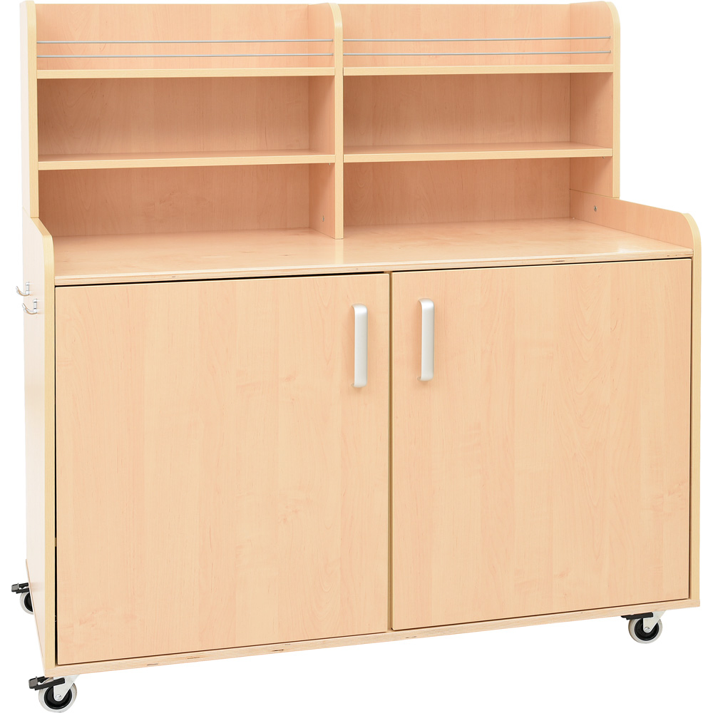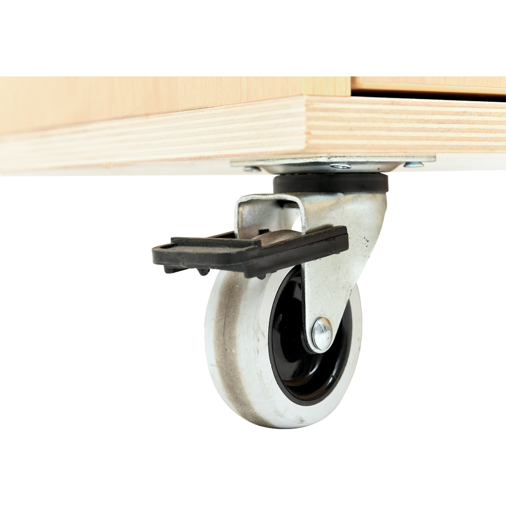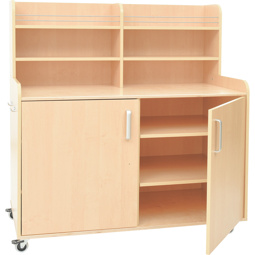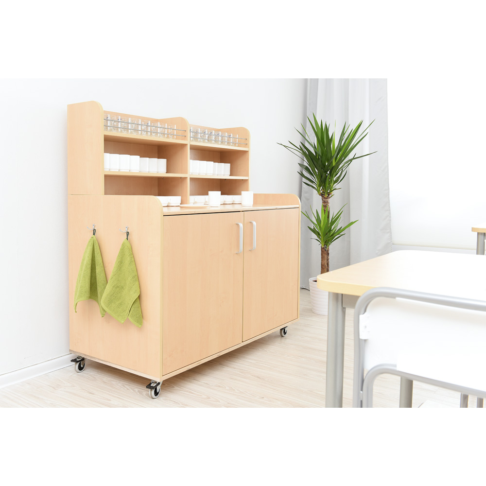 Geräumiges und praktisches Möbelstück zur Aufbewahrung von Geschirr, mit 4 Rollen (2 feststellbar). An der Seite befindet sich ein Metallgriff, zum einfachen Transport; die andere Seite verfügt über Haken. Hinter jeder Tür gibt es 2 Einlegeböden (höhenregulierbar).