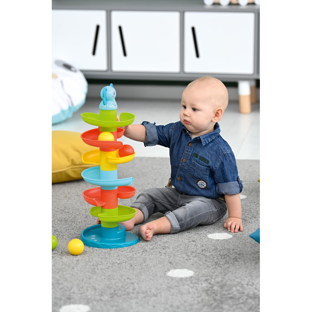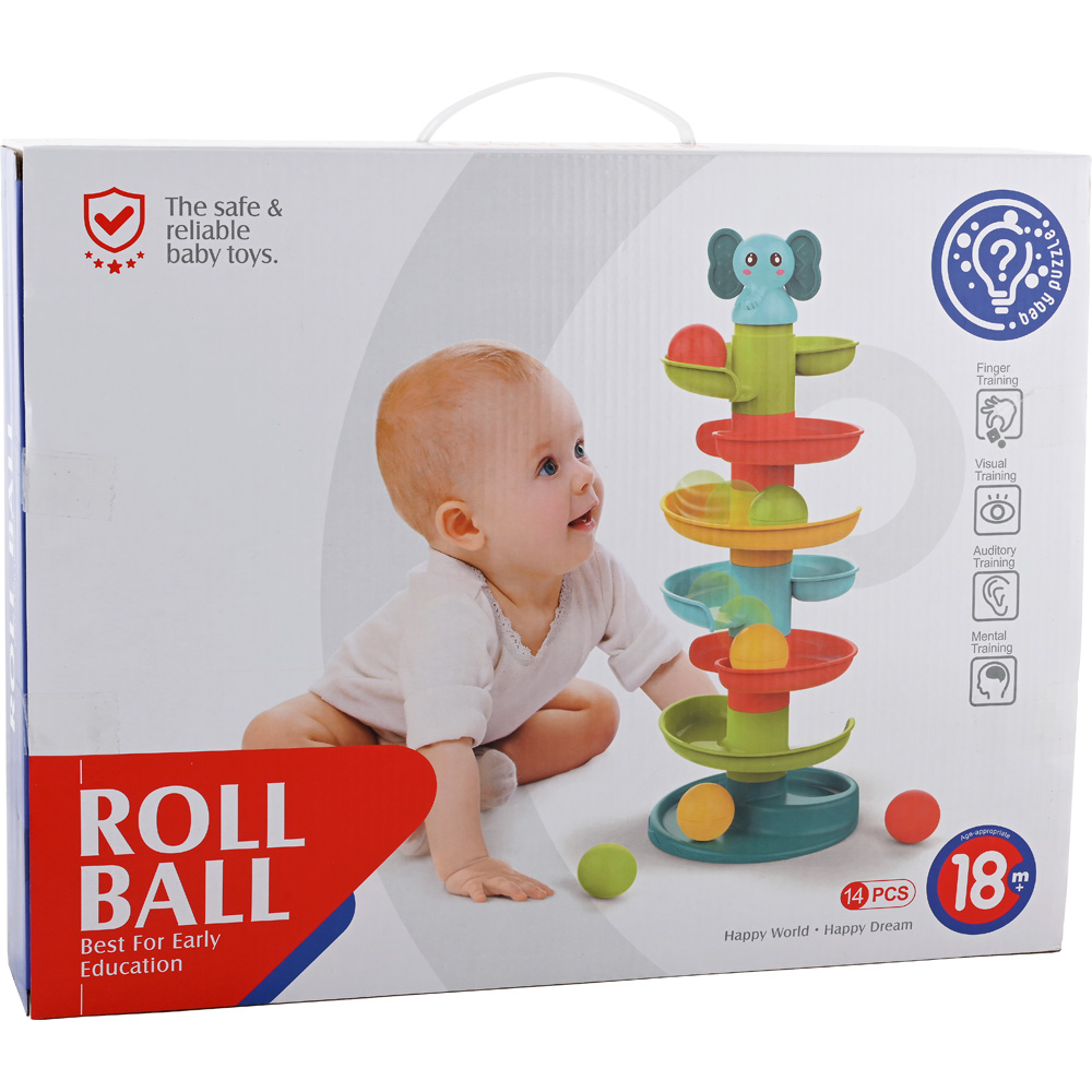 Die siebenteilige Rollbahn ist ein Spielzeug zur Förderung der Feinmotorik und der visuellen und auditiven Wahrnehmung. Nach dem Zusammenbau legt das Kind die Bälle auf den oberen Teil der Rollbahn und beobachtet, wie sie hinunterrollen und auf dem Weg von einer höheren auf die niedrigere Mulde springen. Die Kugeln rasseln beim Runterrollen.