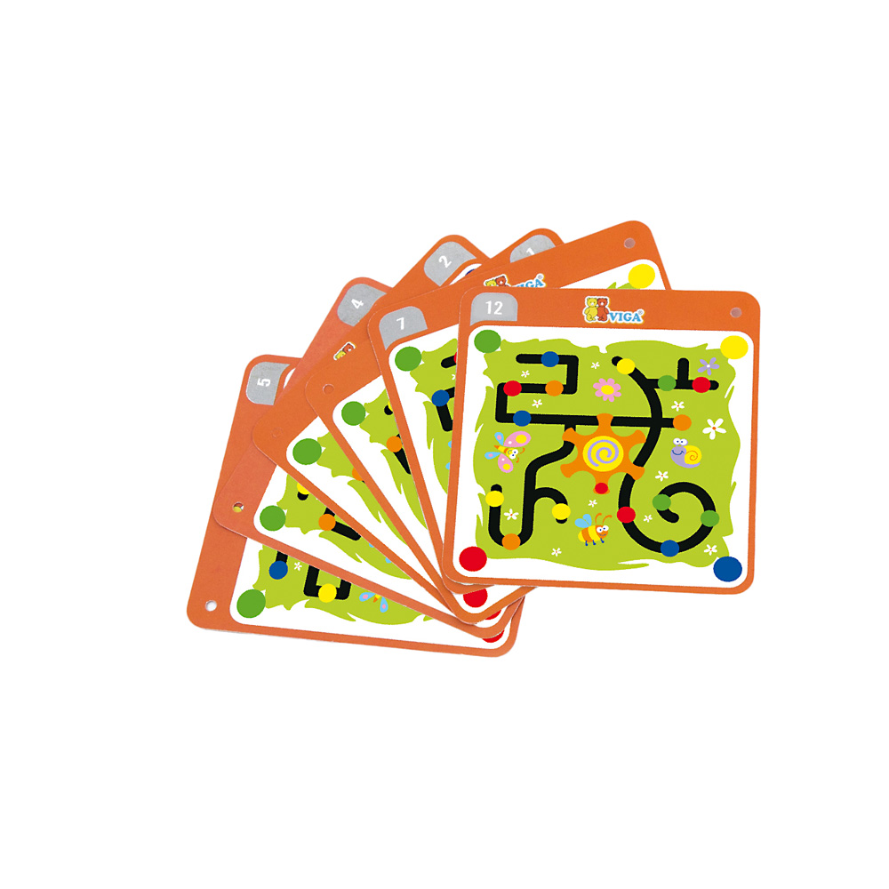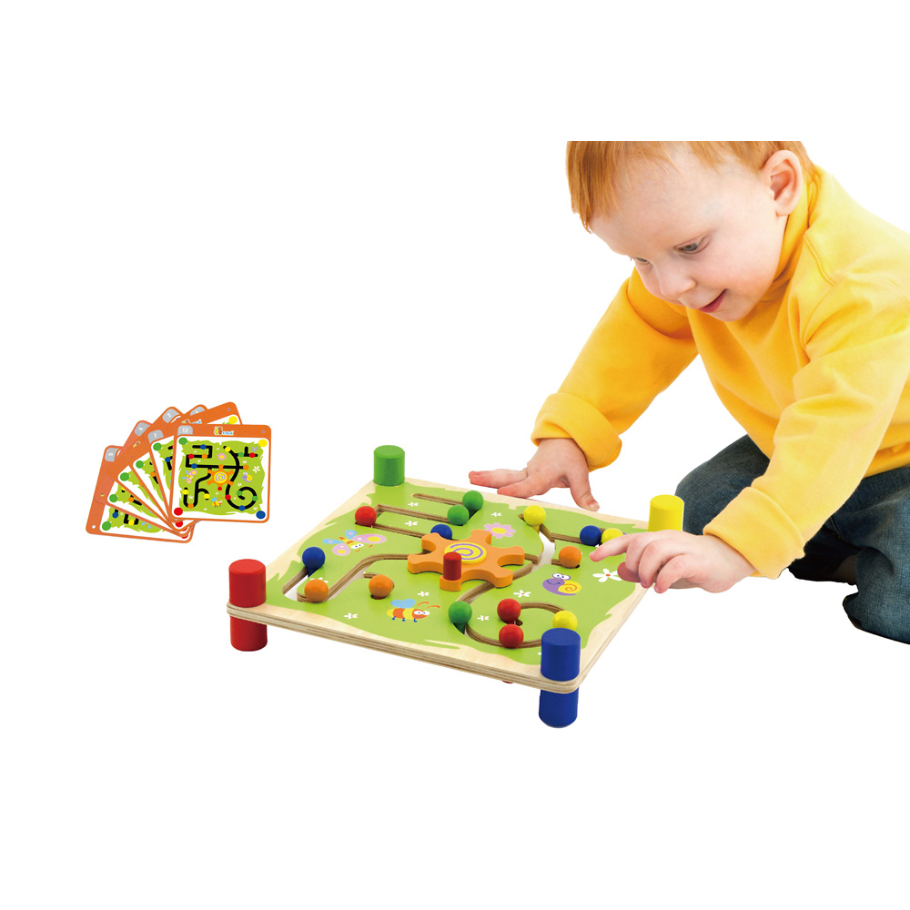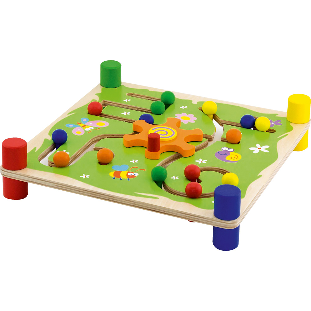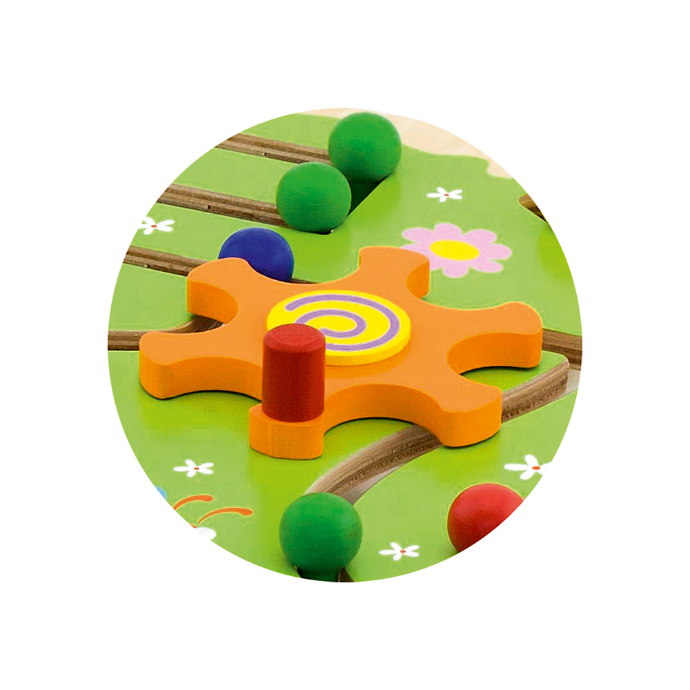 Auf der Holzplatte befinden sich verschiedene Labyrinthe und ein rotierendes Zahnrad in der Mitte. Dieses muss gedreht werden, damit sich die Kugeln den Weg durch die Labyrinthe suchen. Es gibt 12 Muster auf den beigefügten Aufgabenkarten. Schult Geschicklichkeit und analytisches Denken.