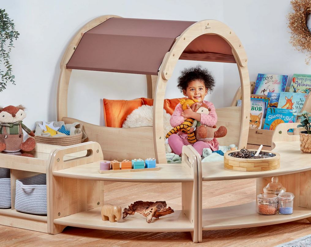 Die Bogenecke bietet einen gemütlichen Rückzugsort zum Lesen, Entspannen oder für ruhige Spiele. Mit ihrer gewölbten Form, neutralen Farbtönen und weichen Materialien ist sie perfekt für Baby- und Kinderzimmer geeignet. Einfach aufzubauen und flexibel zu bewegen.