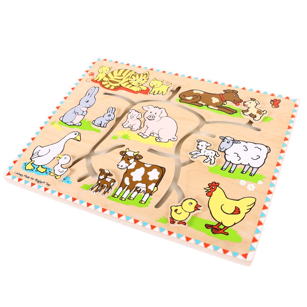 Hilf den Tierbabys ihre Mütter zu finden! Jedes dieser Bauernhoftiere hat ein Junges, das nach Hause finden muss. Die Puzzleteile sind an der hölzernen Grundplatte befestigt und können im Labyrinth entlang geschoben werden, bis das Baby wieder in Sicherheit da ist, wo es hingehört. Fördert Finger- und Zuordnungsfähigkeit und Konzentration. Die hölzernen Grundplatten der Bigjigs Toys Puzzles sind mit Bildern oder Farben bedruckt, um den Lernprozess zu unterstützen und ihren pädagogischen Wert zu erhöhen. Aus hochwertigen Werkstoffen aus verantwortungsbewusst bewirtschafteten Quellen hergestellt. Entspricht den aktuellen europäischen Sicherheitsnormen.
