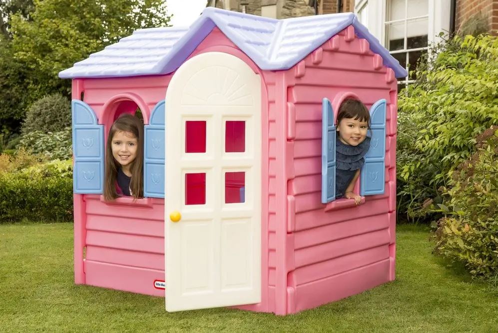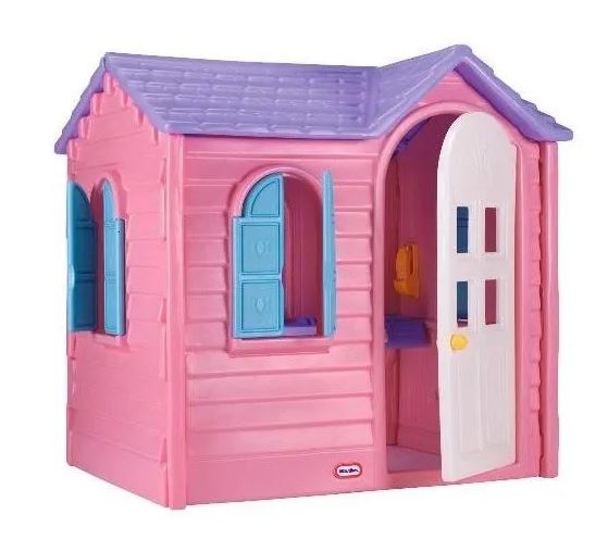 Aus farbigem Kunststoff. Mit beweglichen Fensterläden (4 Paar) und einer hohen Tür mit Fenstern; Innenraum ausgestattet mit Herd, Uhr und Telefon.
