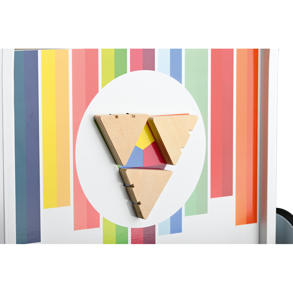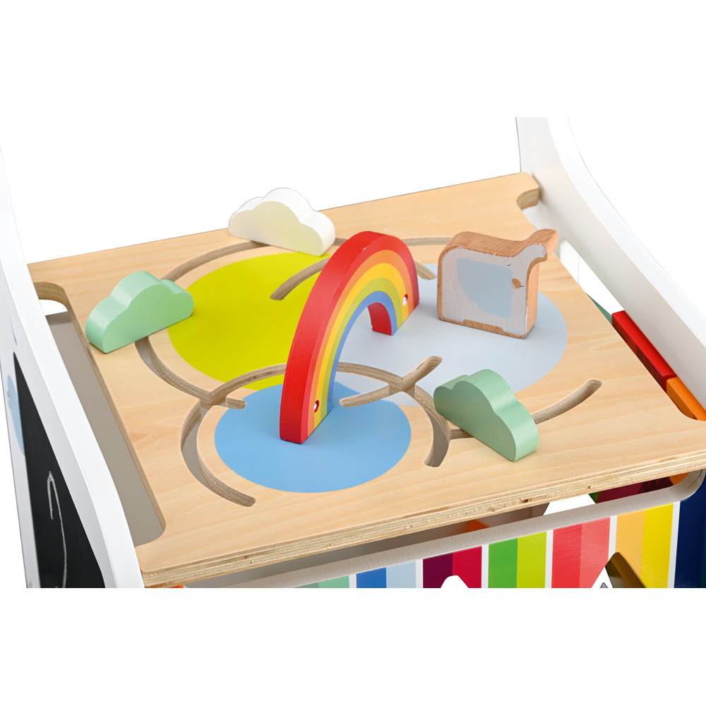 Auf 5 Seiten bietet dieser Lauflernwagen aus Holz vielseitigen Spiel- und Lernspass. Der Regenbogen und seine Farben sind sein zentrales Designelement. Beim Stecken, Schieben und Klappen trainieren die Kleinen ihre Motorik und lernen Farben, Formen und Zahlen kennen. Dank der gummierten Räder sind sie bei ihren ersten Schritten sicher unterwegs. Unter dem aufklappbaren Deckel mit Klemmschutz finden neben Steck-Elementen auch Lieblingsspielsachen ihren Platz. Der Wagen ist leichtläufig und robust. Durch das Bremssystem kann beim Laufenlernen nichts passieren. Eine Kreidetafel animiert dazu, selbst kreativ zu werden! Die Bremse erlaubt es, den Wagen kontrolliert über den Boden zu schieben. Ein praktischer Spielgefährte für Laufanfänger, der durch sein ansprechendes Design Gross und Klein überzeugt.