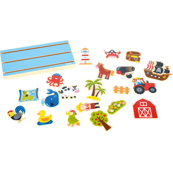 Auf ins Abenteuer! Ob als Pirat auf hoher See oder als Traktorfahrer - erzähle deine Geschichte mithilfe der Figuren, die du wie in einem Theater anordnen und bewegen kannst - in 3 Ebenen dank 3 eingefrästen Rillen. • aus Holz • 10 Bauernhof-Figuren • 9 Schatzinsel-Figuren • Masse der Figuren: 5 bis 8 cm • Grundplatte mit Rillen, Masse: 23 x 11 cm • ab 3 Jahren