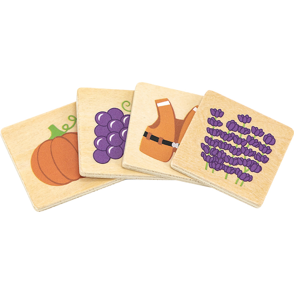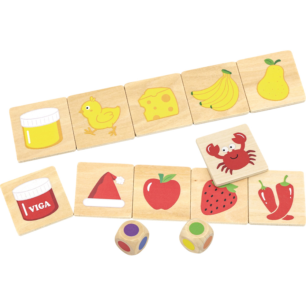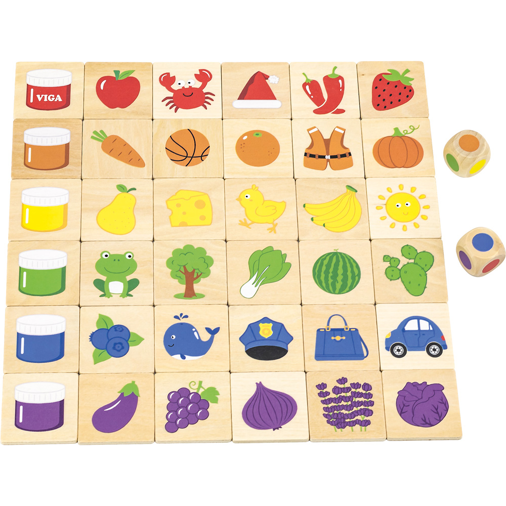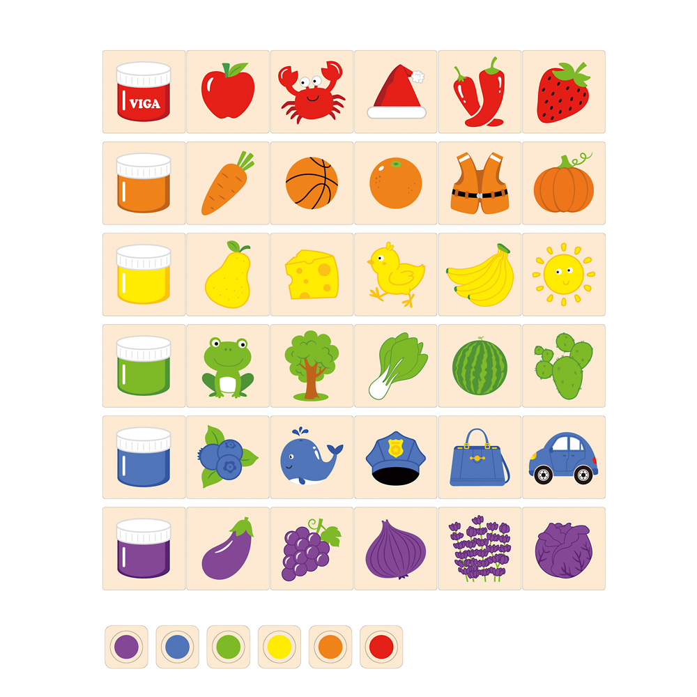 Auf spielerische Weise lernen die Kinder die Farben Rot, Orange, Gelb, Grün, Blau und Violett kennen. Die Legekarten mit Motiv müssen nach der gewürfelten Farbe zugeordnet werden. Ausserdem werden den Kindern die Namen von Obst, Gemüse, Tieren und Gegenständen vermittelt.