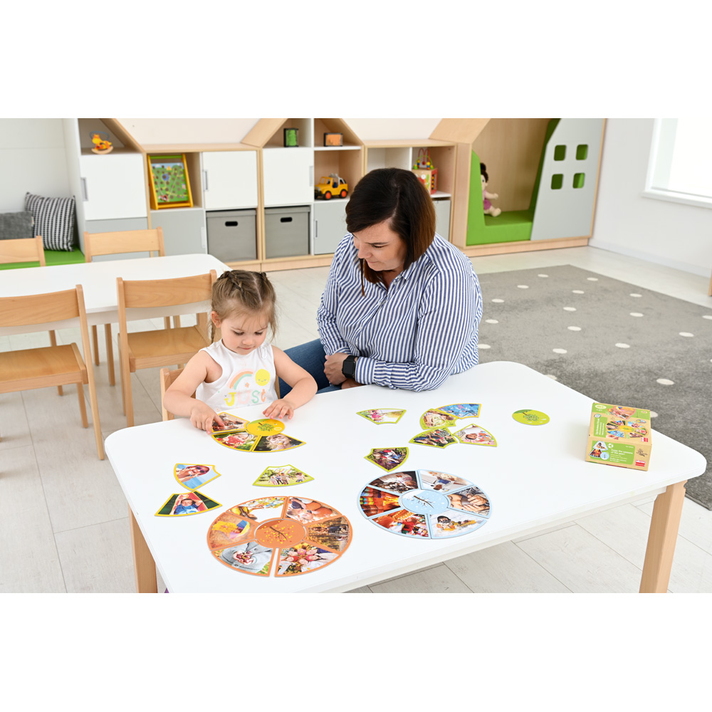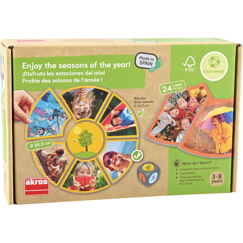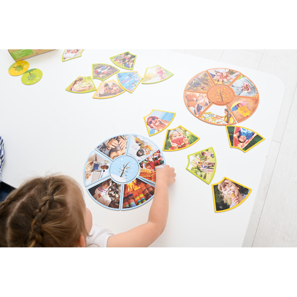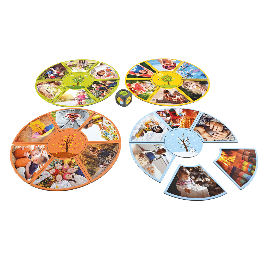 Welche Aktivitäten machen wir im Frühling, Sommer, Herbst und Winter? Für jede Jahreszeit gibt es eine runde Karte. Je nach gewürfeltem Symbol, legt man die passenden Bildkarten herum. Die Kinder können ihr Wissen über die Jahreszeiten austauschen und ihre Lieblingsbeschäftigung mitteilen. Das Spiel fördert die Beobachtungsgabe, das logische Denken und erweitert den Wortschatz.