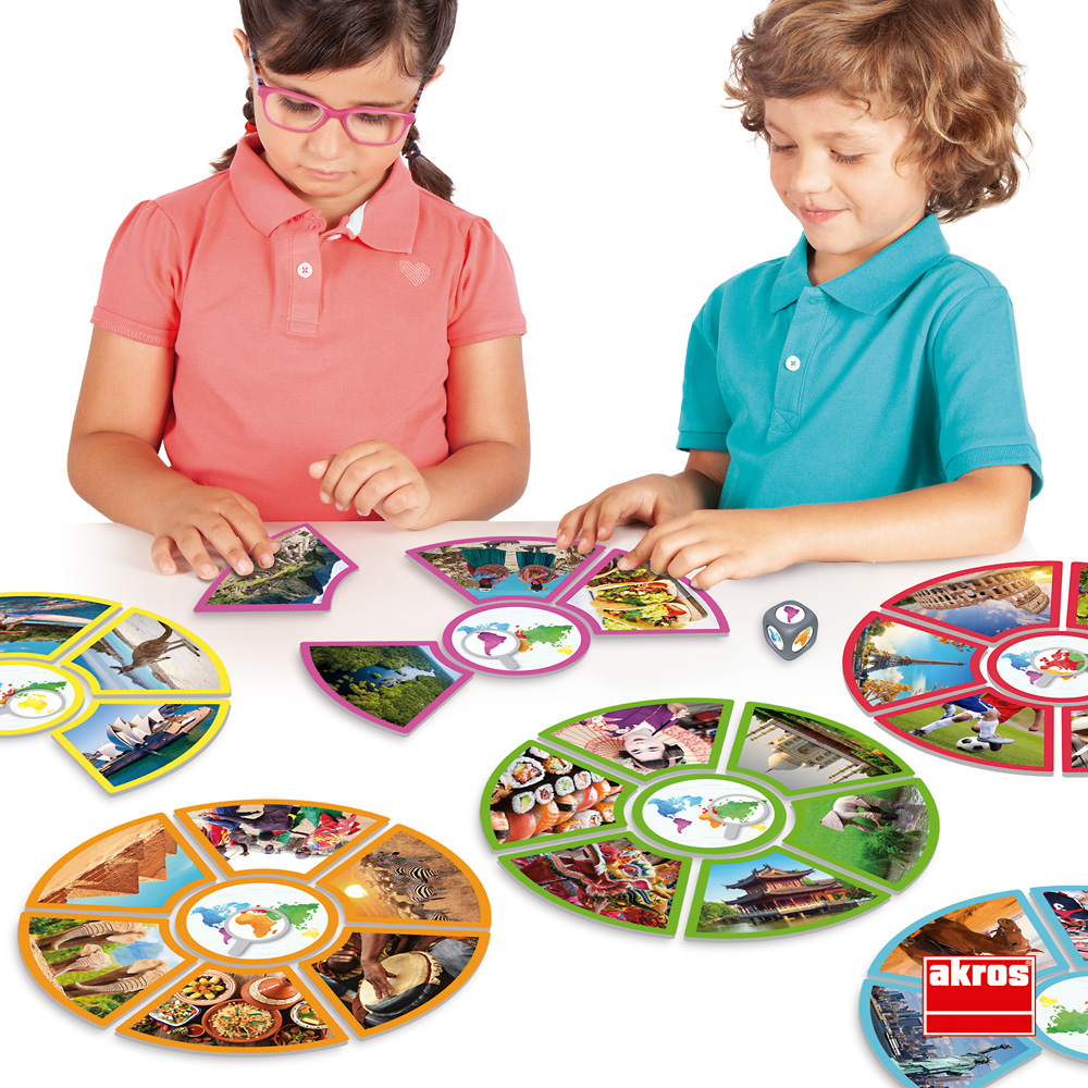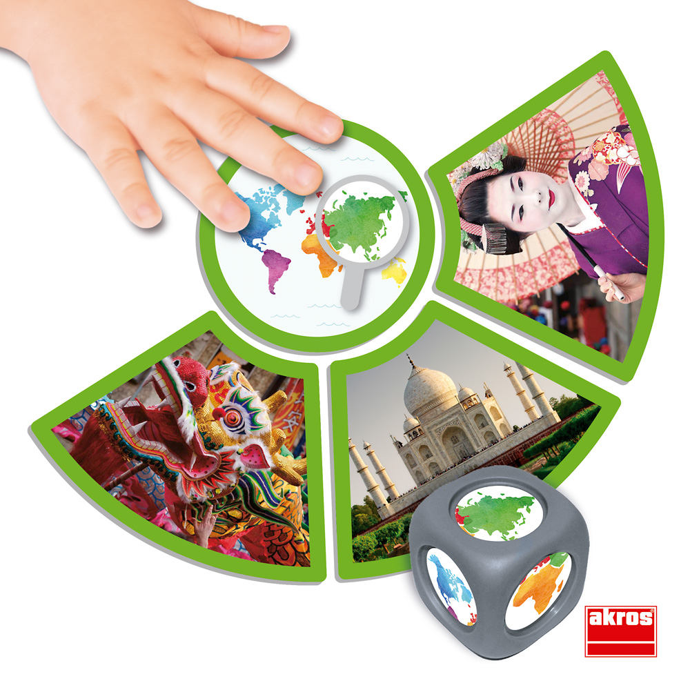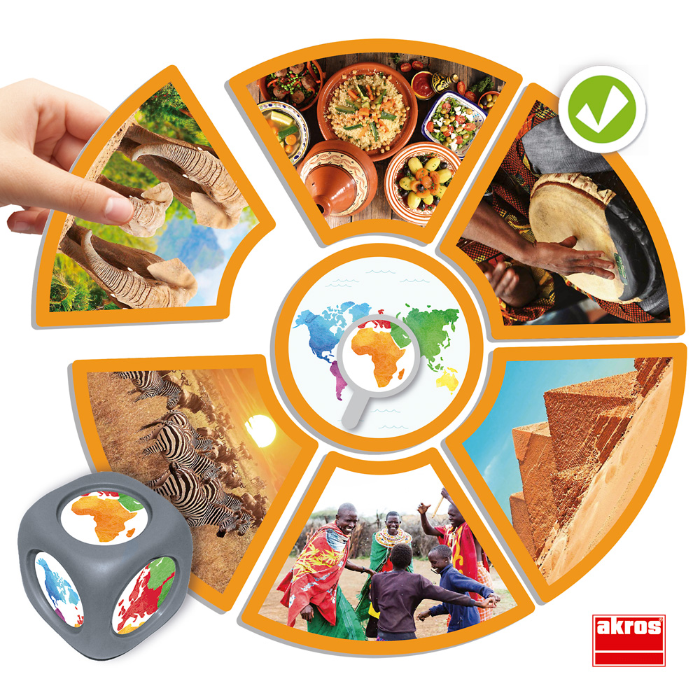 Fremde Kulturen, Traditionen, Landschaften und die geografische Lage der Erdteile kennenlernen. Jeder Kontinent und die ihm zugeordneten Karten sind mit einer bestimmten Farbe gekennzeichnet. Das Spiel schult das logische Denken, die Beobachtungsgabe und erweitert den Wortschatz.