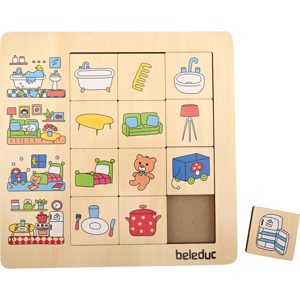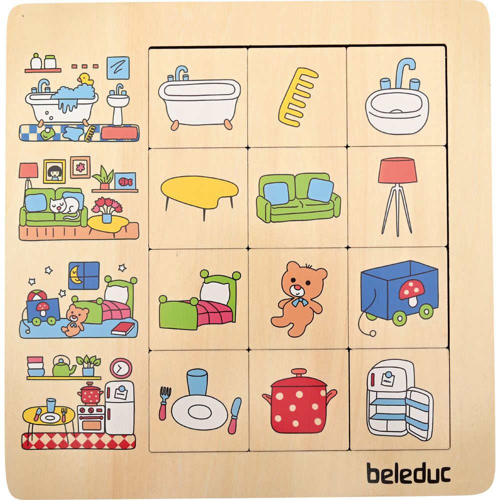 12 Bildtäfelchen sind den Abbildungen auf dem Spielbrett zuzuordnen. Kindgerechte, einfache Motive begeistern schon die Kleinsten. Schult die Beobachtungsgabe, das logische Denken und die Auge-Hand-Koordination. Was gehörte in die Küche oder Bad und was befindet sich im Wohnzimmer oder in deinem Kinderzimmer? Jedes Zimmer des Hauses ist mit anderen Gegenständen ausgestattet. Finde sie und ordne sie zu.
