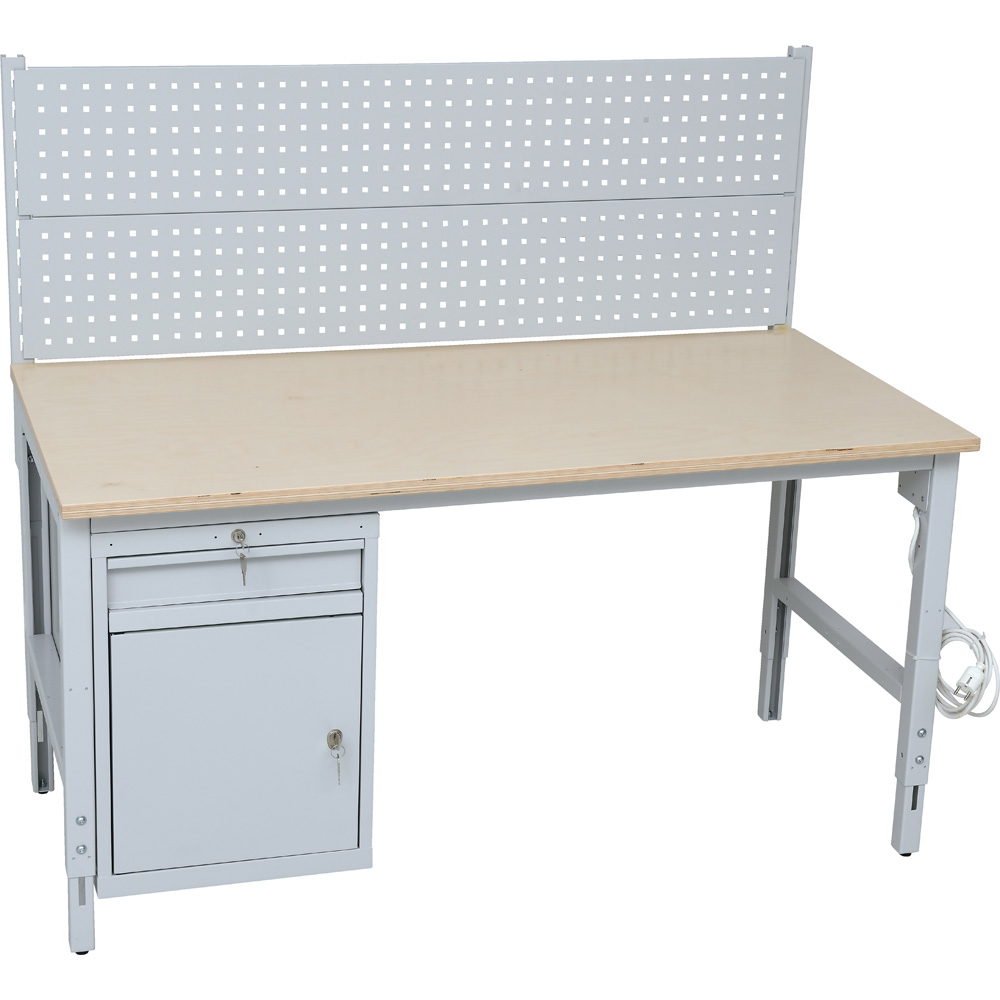 Werkbank mit Stahlprofilgestell und Tischplatte aus lackiertem Sperrholz (Stärke 24 mm). Ausgestattet mit Steckdose (230 V) und Netzkabel (3 m). Inklusive Werkzeuglochplatte (H 51 cm), die am Tisch montiert wird. Das Gestell ist höhenverstellbar bis 35 cm und verfügt über Nivellierfüsse zum Ausgleich von Bodenunebenheiten.