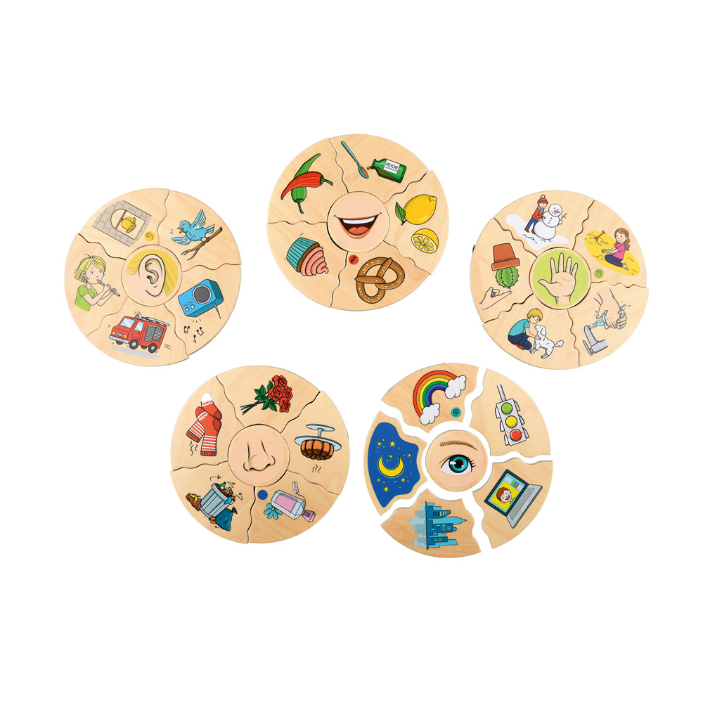 Set für 5 runde Holzpuzzles, mit denen das Kind lernt, die Sinne zu benennen und zu unterscheiden. Die Bilder auf den Puzzleteilen werden einem bestimmten Sinn zugeordnet. Ausserdem erweitert das Spiel den Wortschatz und fördert die Kommunikationsfähigkeit, indem die Kinder die auf den Puzzles sichtbaren Gegenstände und Situationen benennen und beschreiben.