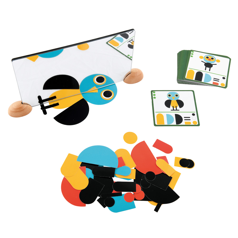 Kinder lernen, mit dem Spiegelbild zu spielen. Sie bilden die auf den Vorlagekarten abgebildeten Tiere nach, indem sie die Kartonfiguren unter den Spiegel schieben und übereinanderlegen. Wenn ein Stöckchen unter den Spiegel geschoben wird, wird es zu einem ganz kleinen Punkt. Der Spiegel ist nämlich ein Zauberspiegel! Das Kind verändert das Spiegelbild, indem es die Formen unter den Spiegel schiebt. Alles verwandelt sich und die Tiere werden lebendig! Die Kinder werden auch Spass daran haben, ihre eigenen Tiere zu gestalten.