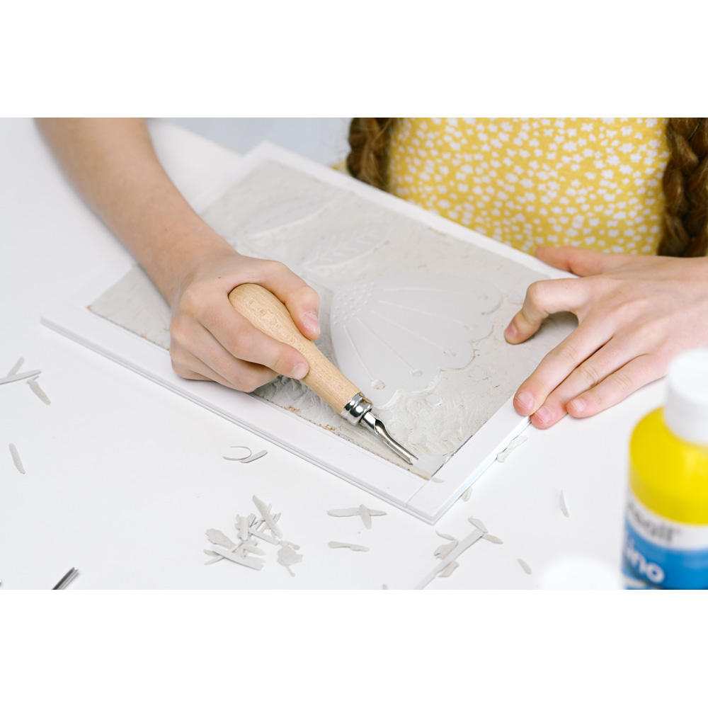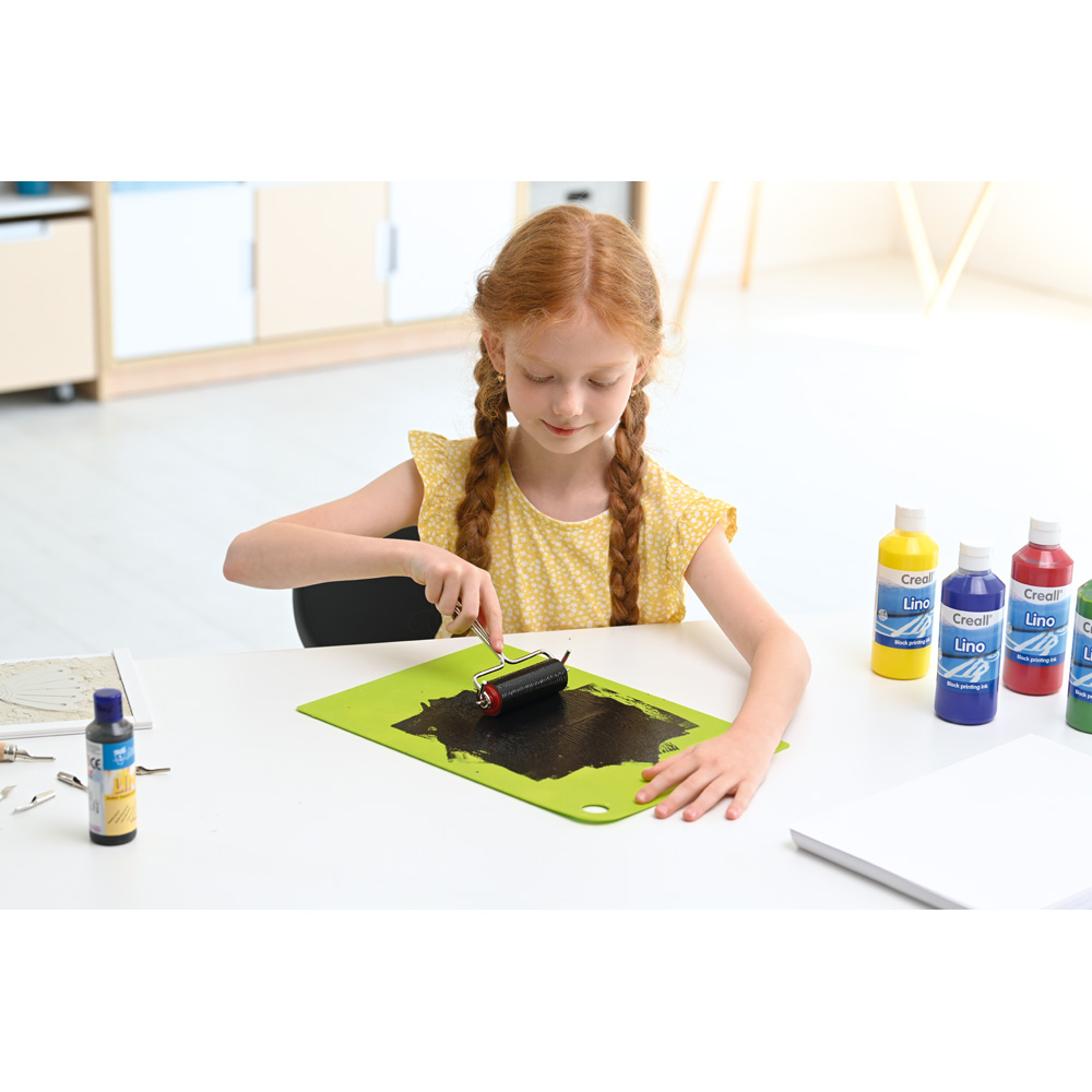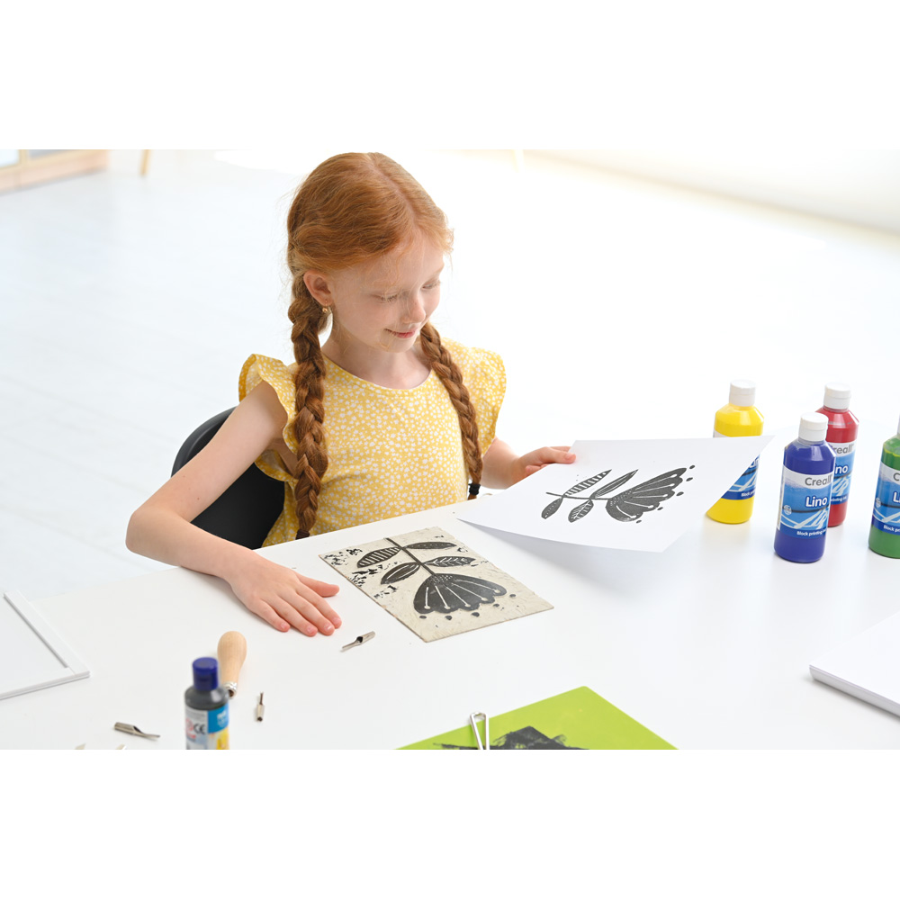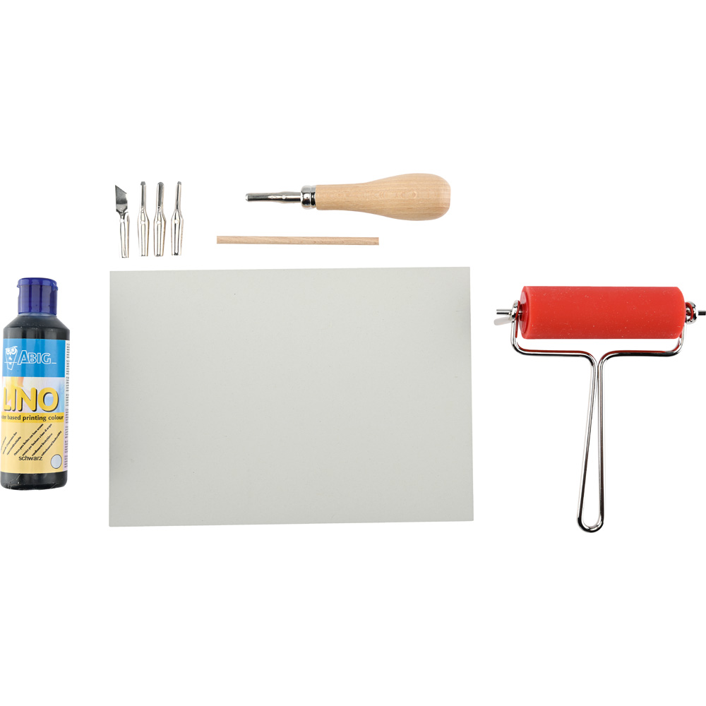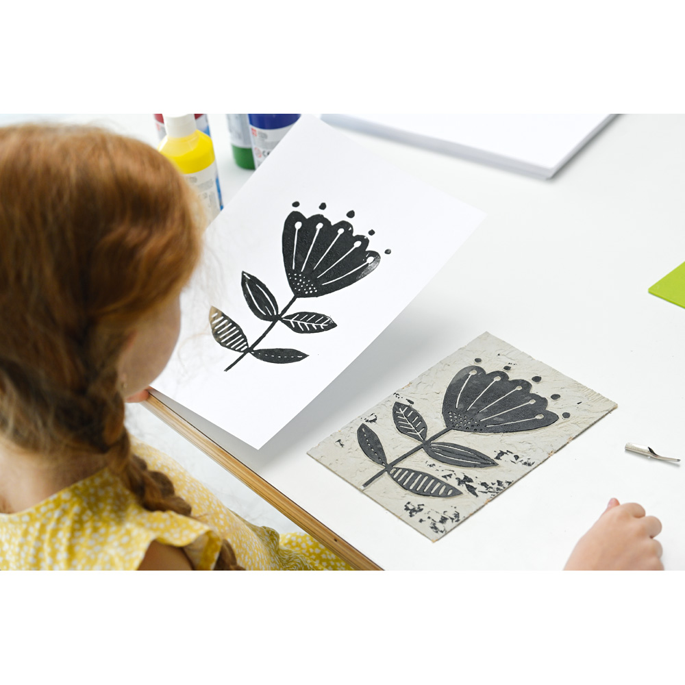 Alles, was man benötigt, um Linolschnitte im Format A5 (15 x 21 cm) herzustellen. Mit diesem grossen Set werden die Kinder viel Spass haben und können kreativ sein. Für Kindergarten, Schule und Hort geeignet.