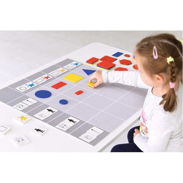 Legematte mit Koordinatensystem für Übungen im Sortieren, Klassifizieren, Codieren und Decodieren. Kriterien werden mit Symbolkarten (199170) vorgegeben, in die Felder sortiert werden Figuren (500014), beide separat erhältlich. Man kann auch die Figuren auf der Matte auslegen und dann die entsprechenden Kriterien zuordnen. Die Kinder können beobachten, wie die Figuren ihren Platz ändern, nachdem die Kriterien geändert wurden. Das Spiel schult das logische Denken und fördert die räumliche Orientierung.