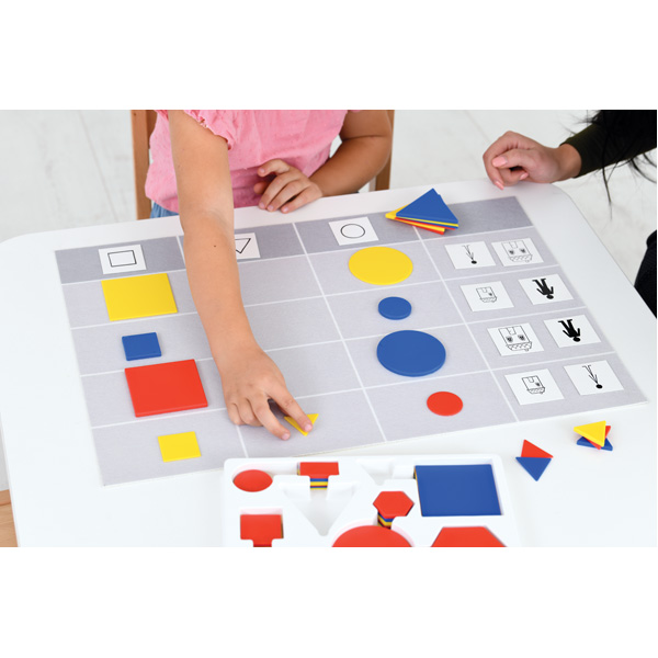 Legematten mit Raster für Übungen im Sortieren, Klassifizieren, Codieren und Decodieren. Die Kriterien werden mit Symbolkarten (199170) vorgegeben. Figuren (500014) werden dann entsprechend sortiert. Das Spiel fördert räumliche Orientierung und festigt Richtungsbegriffe wie: links, rechts, oben, unten.