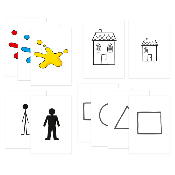 Symbolkarten mit Farbe, Form, Grösse, Stärke. Werden als Kriterien zum Sortieren und Klassifizieren eingesetzt.