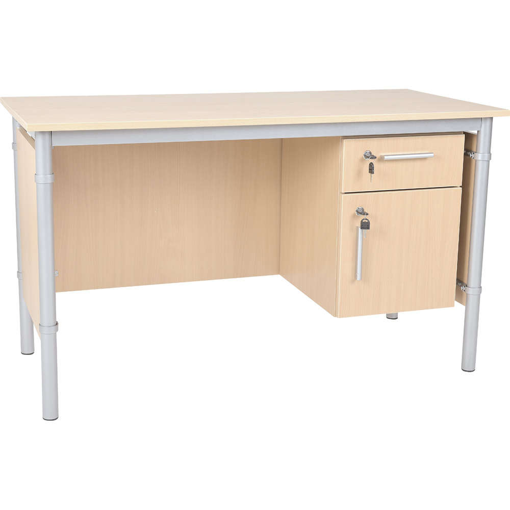 Aus laminierter Spanplatte (Stärke 18 mm) in Ahorn-Optik mit runden Metallbeinen (Durchmesser: 40 mm) und Metalltischrahmen (40 x 20 mm), alufarben.