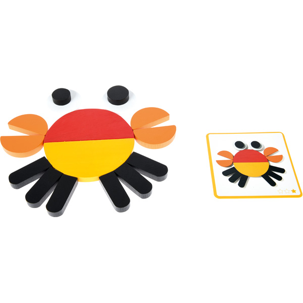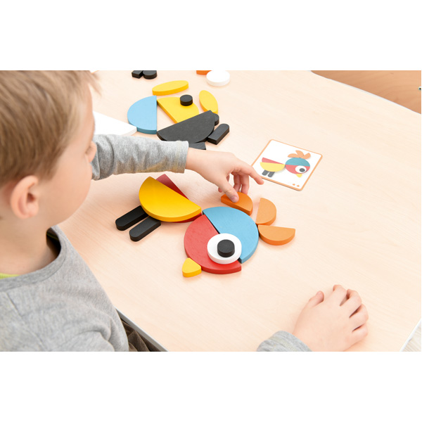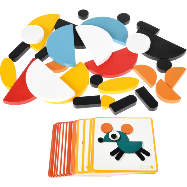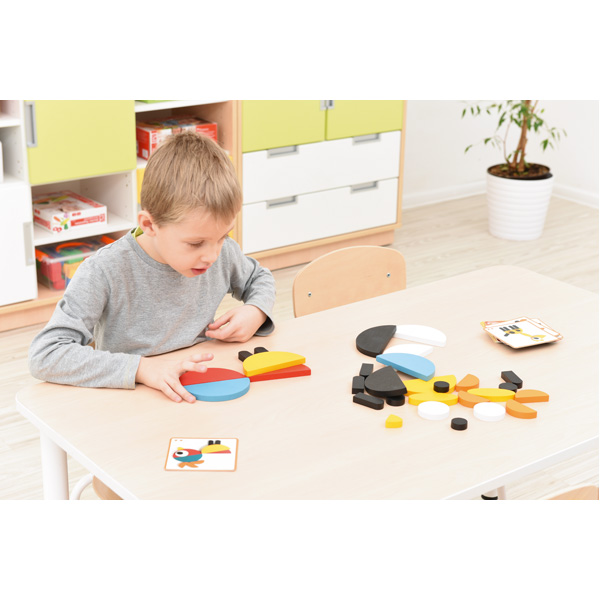 Legespiel mit Vorlagen in 3 Schwierigkeitsgraden. Kinder lernen Farben und Formen zu benennen und zu unterscheiden. Das Spiel fördert Handmotorik, Wahrnehmungsvermögen und visuelles Gedächtnis.