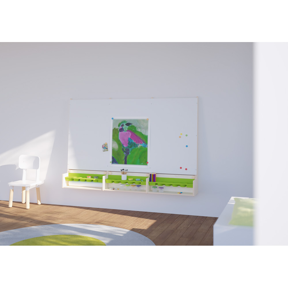 Bietet Nachwuchskünstlern viel Platz, um kreativ tätig zu sein. An der breiten Malfläche können gleich mehrere Kinder mit Pinsel und Farbe arbeiten. Das Zeichenpapier lässt sich auf unterschiedlichen Höhen anbringen, so dass auch die Kleinsten an der Tafel arbeiten können. Auf den drei herausnehmbaren, abwaschbaren Ablagen aus Kunststoff und dem Ablagefach ist viel Platz für Wasserbecher, Pinsel, Farben und allerlei andere Malutensilien.