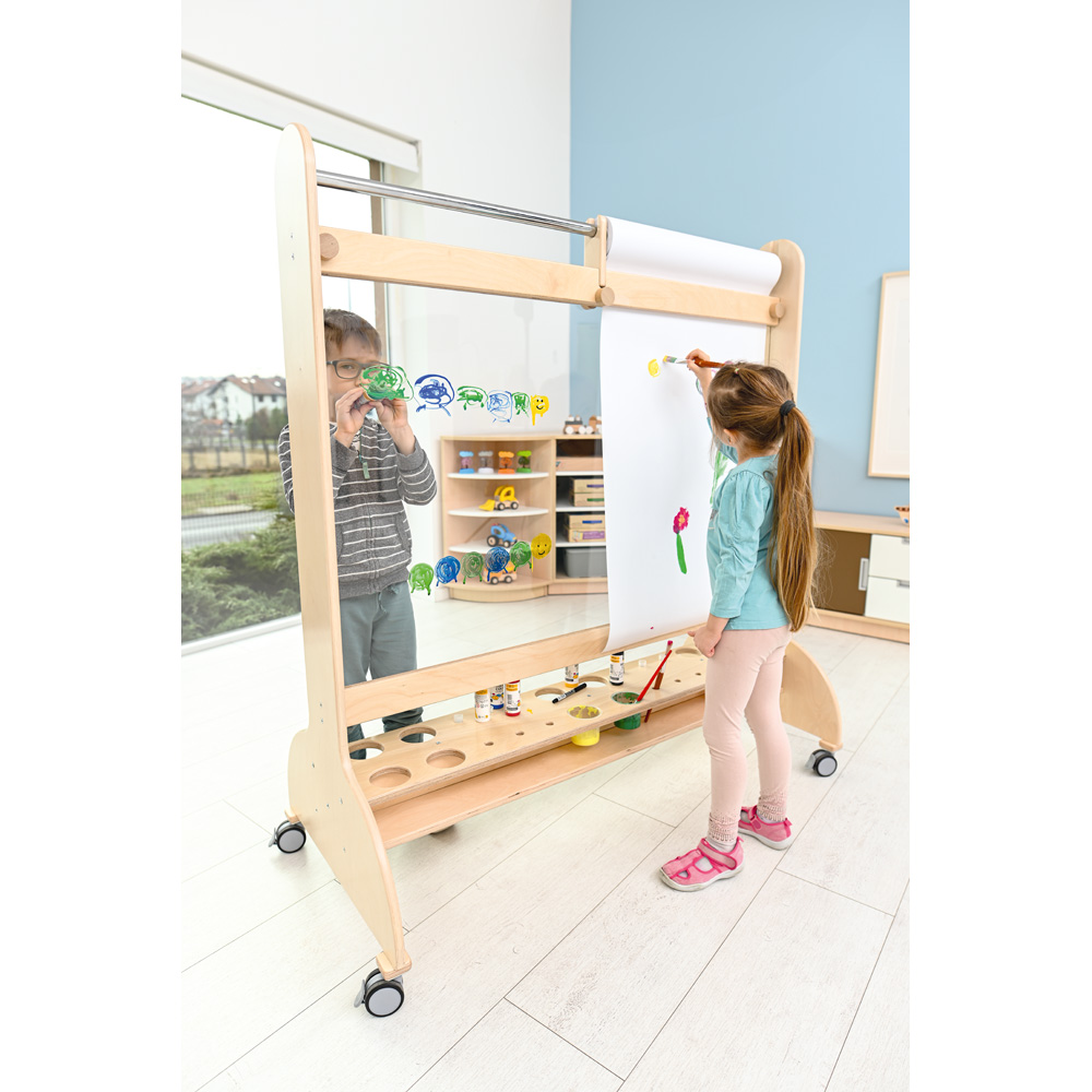 Bietet Platz für bis zu 4 kreative kleine Künstler, welche z.B. mit Fingerfarben direkt auf der transparenten Tafelfläche malen können oder die Papierrolle als Zeichenuntergrund nutzen. Das Austauschen oder Einsetzen der Papierrollen ist ganz einfach. Passend für 2 Papierrollen (654050, Breite: 60 cm, separat bestellbar). Der fahrbare Malwagen hat auf beiden Seiten Griffe, so kann er einfach verschoben werden. Die integrierte Leiste hat unterschiedliche Lochbohrungen zum Aufbewahren von Farben, Stiften und Pinseln (separat bestellbar).