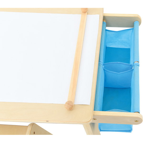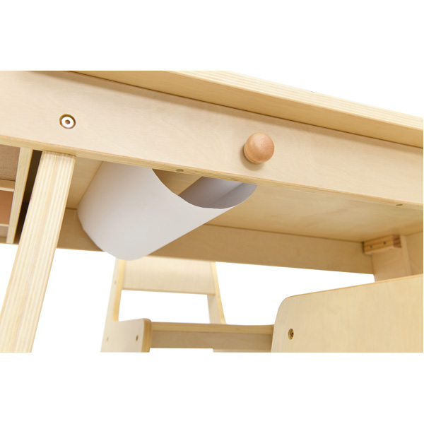 Tisch mit Papierhalterung und seitlichen Ablagen für Malutensilien. 2 Stühle und 1 Papierrolle im Set enthalten.