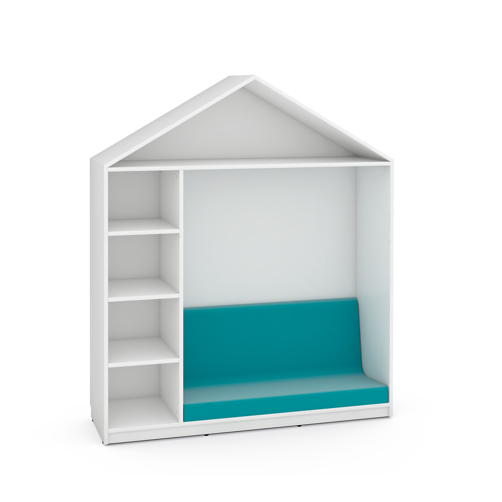 Das Bücherregal in Hausdesign bietet Platz für Lieblingsbücher und die gepolsterte Sitznische lädt zum Verweilen ein. Passende Sitzmatte (855283, 855284) ist separat erhältlich. Die kleinen Fächer können optional mit farbigen Feria Türen S (855552-855555 lackiert oder 855564-855567 laminiert) ergänzt werden.