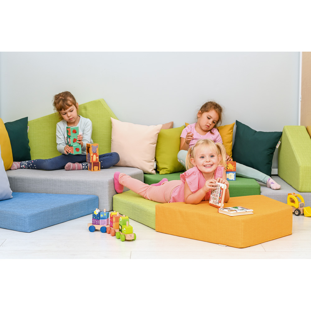 Mit den Schaumstoffmatten Quadro eröffnen sich ganz neue Wege der Raumgestaltung; die vielen Farben, Formen und Grössen laden zum Gestalten fantasievoller Spiel- und Erholungsecken ein. Der äusserst strapazierfähige, unempfindliche Bezug aus Inflamea macht die Matten Quadro zum perfekten Begleiter in Kindergärten und Schulen. Das Material aus 100 % Polyester ist fleck- und feuchtigkeitsabweisend; Schmutz oder verschüttete Flüssigkeiten dringen gar nicht erst ins Gewebe ein und lassen sich ganz einfach abwischen bzw. aufsaugen, ohne dass Fleckenränder zurückbleiben. Inflamea ist zudem schwerentflammbar und enspricht Brandschutzklasse B1 nach DIN 4102. Füllung aus Schaumstoff mit Raumgewicht 24 kg/m3. In der Ausführung Quadro 2 ist auch der Schaumstoff schwerentflammbar; Raumgewicht 25 kg/m3.