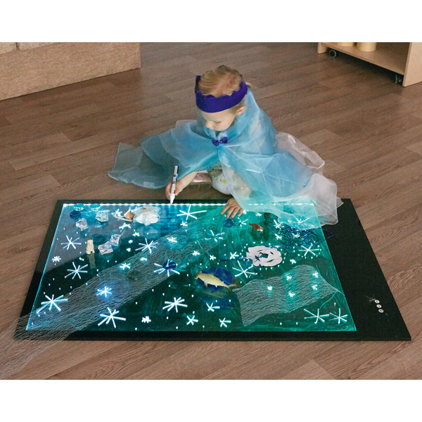 Eine riesige Tafel zum Malen und Schreiben, die in 7 verschiedenen Farben leuchtet und Kinder-Kunstwerke zum Leben erweckt. Sie ist gross genug, um mehrere Kinder gemeinsam arbeiten zu lassen. Auf Knopfdruck kann jede Tafelhälfte einzeln zum Leuchten gebracht werden. Die Einsatzmöglichkeiten sind vielfältig, so auch in Rollenspielen, z.B. als gefrorener See, Feenland oder als Notepad des Superhelden. Geeignet für alle trocken abwischbaren Boardmarker; besonders effektvoll sind fluoreszierende Flüssigkreidemarker (356178, separat zu bestellen).