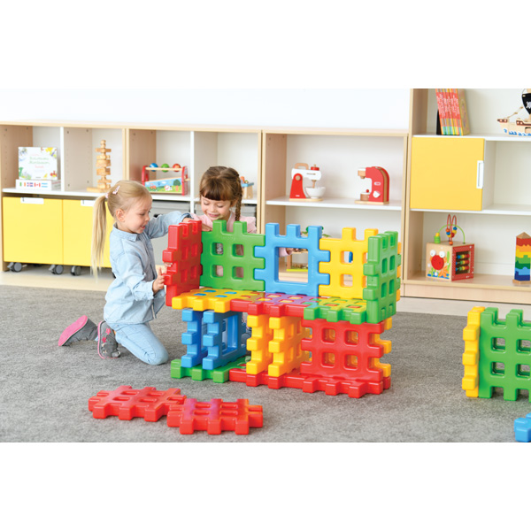Die grossen Bausteine aus Kunststoff lassen sich gut zu verschiedenen Bauwerken zusammenstecken, in deren Inneres man dank der Waffelbauweise Einblick hat. Durch die unterschiedlichen Farben und Grössen können die Kinder ihrer Fantasie freien Lauf lassen; fördert Kreativität und motorische Fähigkeiten.