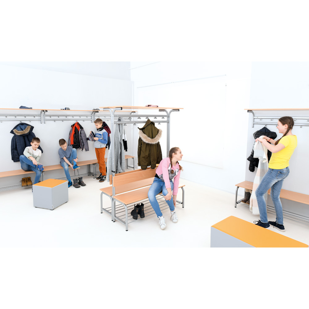 Die Garderoben werden in einer Reihe vor der Wand oder Rücken an Rücken frei im Raum aufgestellt. Durch das rückseitige Verbinden zweier Garderoben entsteht eine beidseitig nutzbare Kombination.