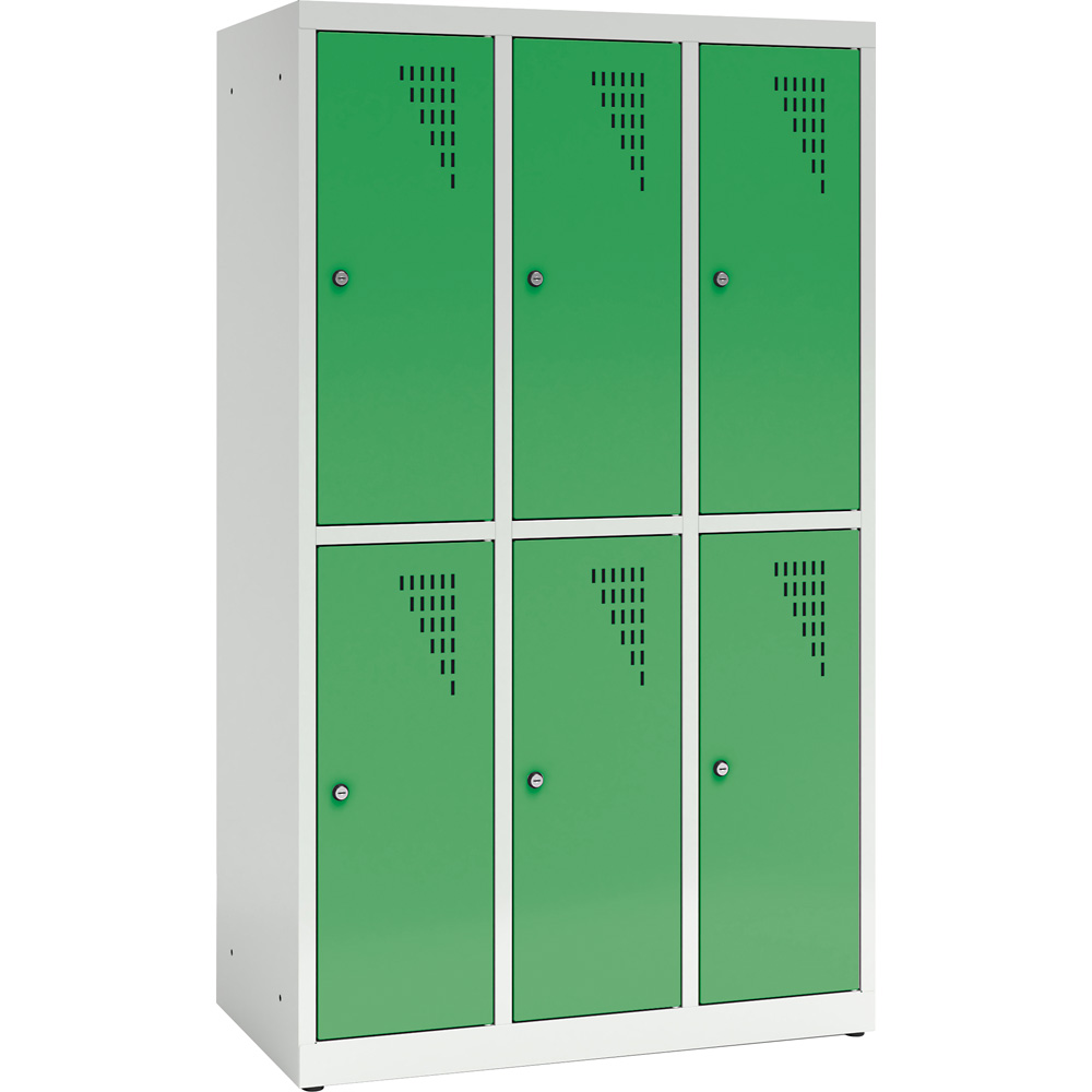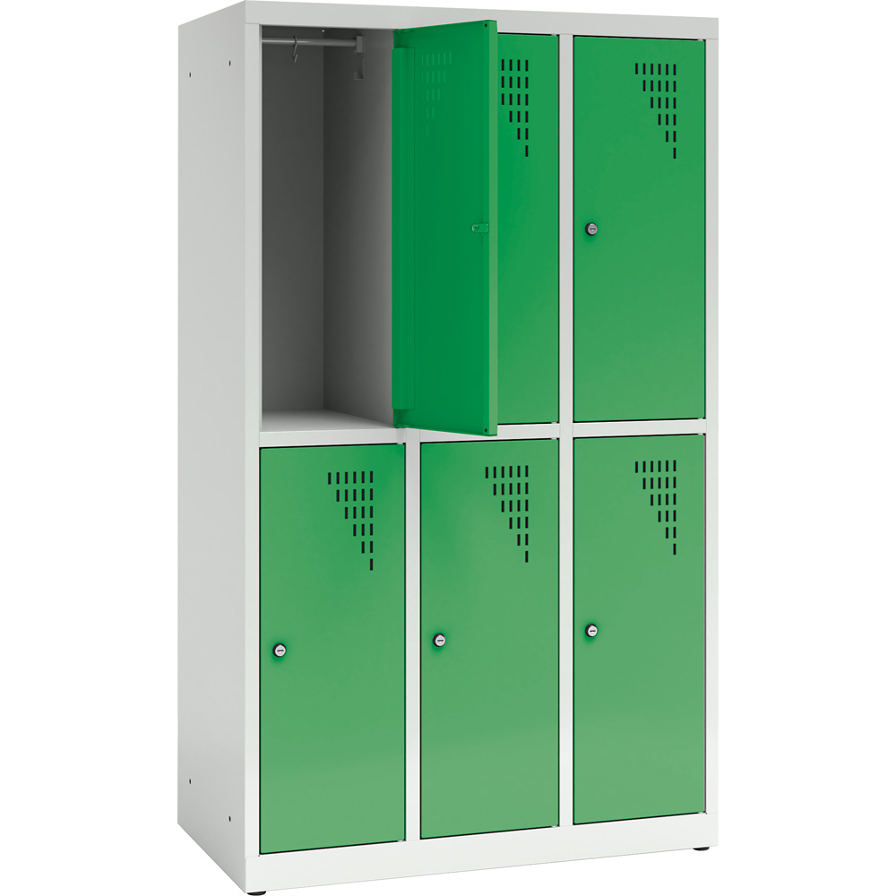 Die stabilen Spinde aus Stahlblech sind mit Lüftungsschlitzen in den Türen und Platz für Namensschilder ausgestattet; ein Ein-Punkt-Schloss sorgt für Sicherheit. Jedes Fach ist mit Kleiderstange, 2 Kleiderhaken und einer zusätzlichen Ablage ausgestattet. Die Schränke können miteinander und an der Wand verschraubt werden, was die Standsicherheit erhöht. An die Schränke können zusätzlich justierbare Beine (805121 - H 11 cm - separat bestellbar) montiert werden. Sollten die Schlüssel verloren gehen, lassen sich die Türen mit dem Master-Schlüssel (805142, separat bestellbar) öffnen.