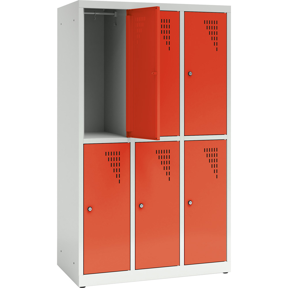 Die stabilen Spinde aus Stahlblech sind mit Lüftungsschlitzen in den Türen und Platz für Namensschilder ausgestattet; ein Ein-Punkt-Schloss sorgt für Sicherheit. Jedes Fach ist mit Kleiderstange, 2 Kleiderhaken und einer zusätzlichen Ablage ausgestattet. Die Schränke können miteinander und an der Wand verschraubt werden, was die Standsicherheit erhöht. An die Schränke können zusätzlich justierbare Beine (805121 - H 11 cm - separat bestellbar) montiert werden. Sollten die Schlüssel verloren gehen, lassen sich die Türen mit dem Master-Schlüssel (805142, separat bestellbar) öffnen.