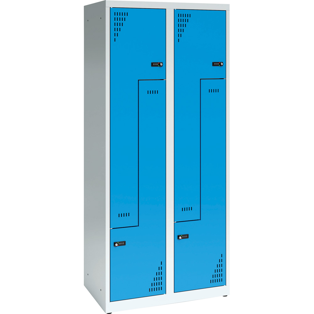 Die stabilen Spinde aus Stahlblech sind mit abschliessbaren Türen in L-Form ausgestattet; mit Zahlenschloss. Mit Lüftungsschlitzen in den Türen und Platz für Namensschilder. Jedes Fach verfügt über eine Kleiderstange und 2 Haken. Durch zusätzliche Bohrungen können die Spinde miteinander verbunden oder an der Wand befestigt werden, was die Stabilität verbessert.