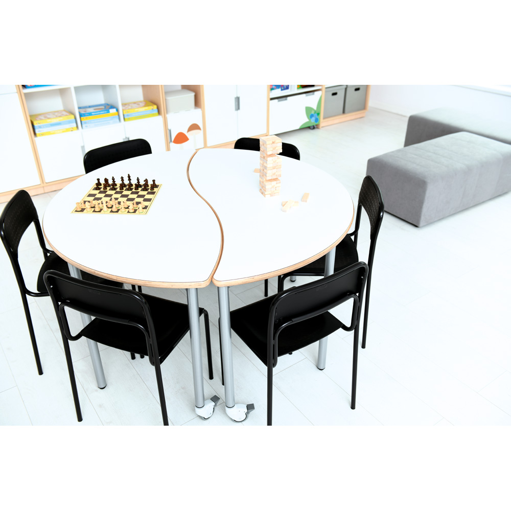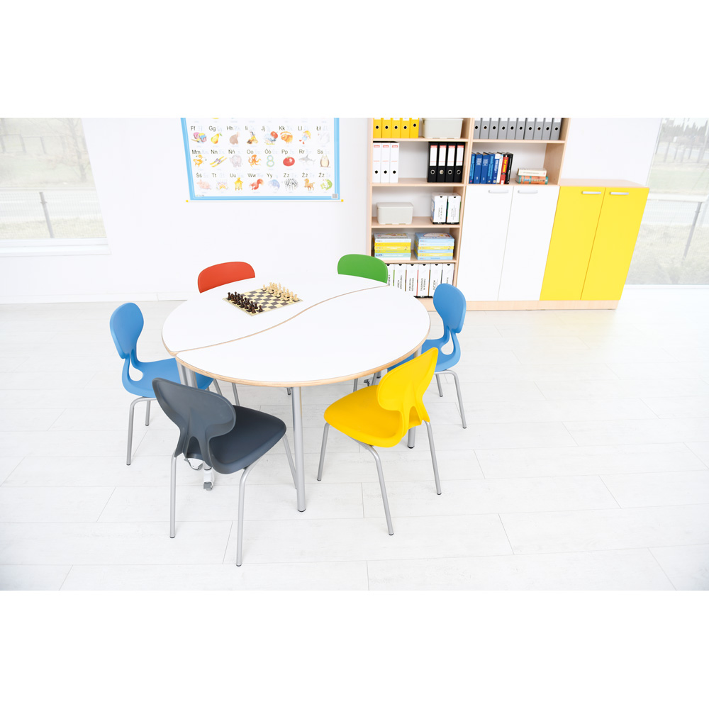 Tischrahmen aus Vierkantrohr (40 x 20 mm), runde Metallbeine (Ø 40 mm, alufarben) in verschiedenen festen Höhen. Kunststoffgleiter an den Beinen verhindern das Zerkratzen des Fussbodens. Die Tischbeine sind wahlweise auch mit Rollen erhältlich (1 Rolle bei dreieckigen Tischplatten, 2 Rollen bei allen anderen Formen), Rollen feststellbar. Sie erleichtern das Verschieben der Tische - so kann man schnell von Einzel- zu Gruppenarbeit übergehen. Bitte beachten Sie hierzu den Mehrpreis. Sollten Sie im Online-Angebot die gewünschte Tischform mit Rollen nicht finden, fragen Sie bei unseren Mitarbeitern nach. Wir beraten Sie gerne.