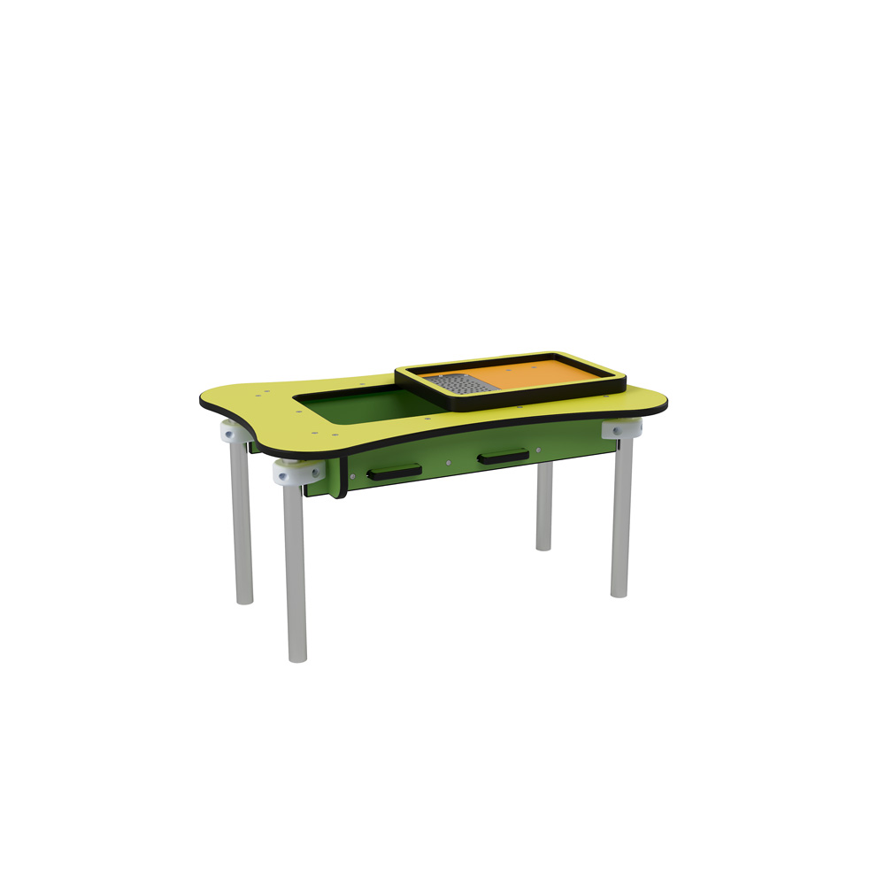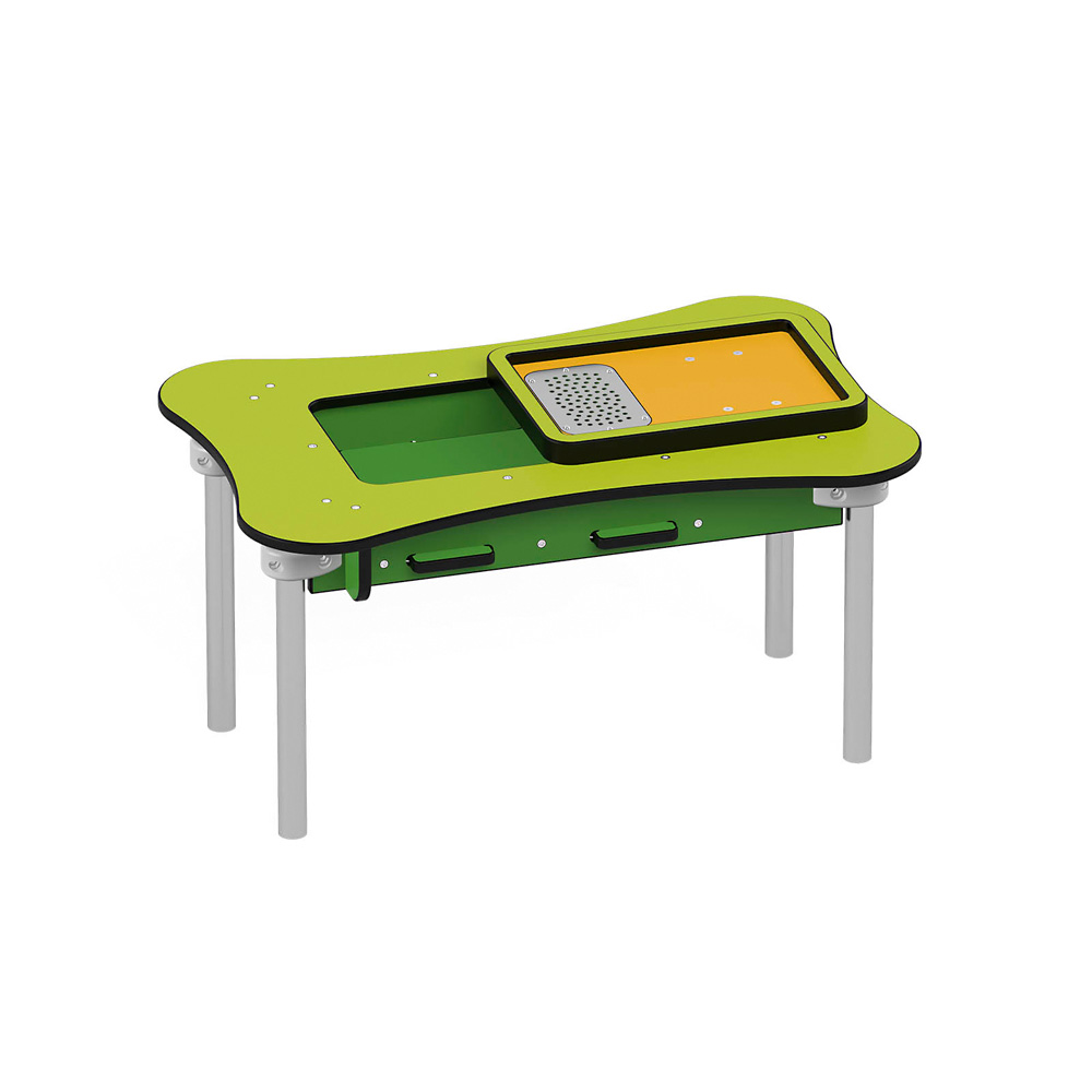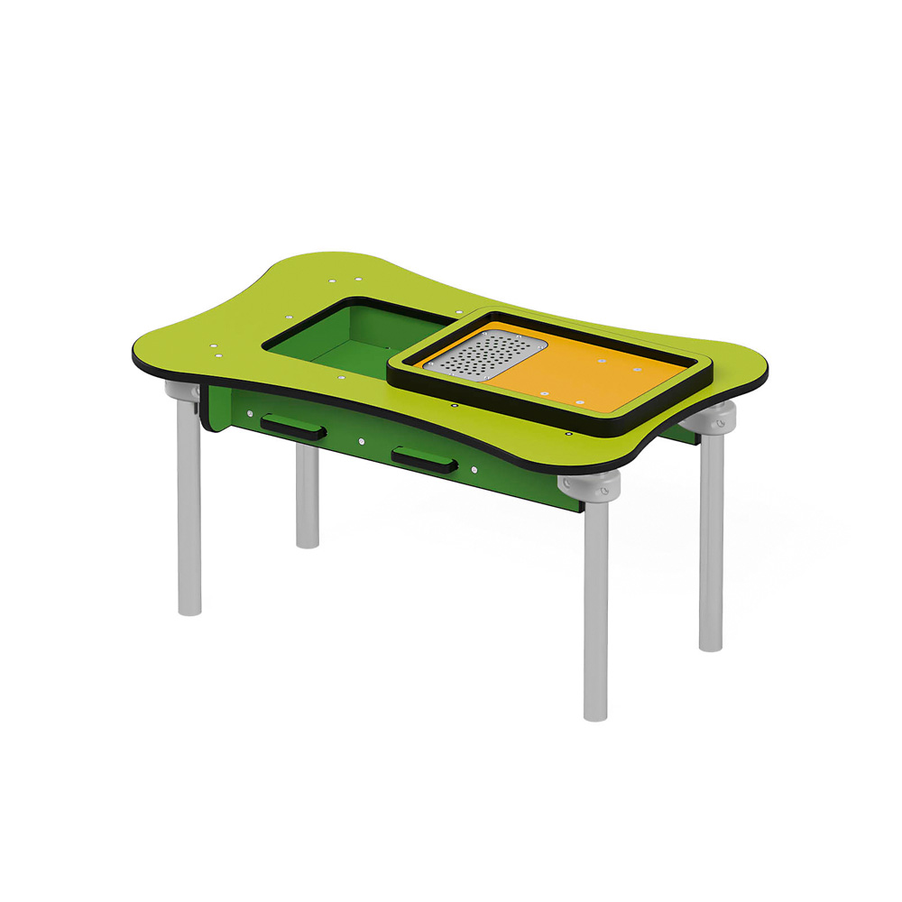 In der Sandfabrik 3 bieten ein grosser Tisch, ein bewegliches Sandsieb und ein Sammelbecken mit Ausschüttöffnung viele Möglichkeiten für Experimente. • Anzahl der Nutzer: 4 • Grundfläche: 83 x 54 cm • Sicherheitsbereich: 383 x 354 cm (Fläche: 11,6 m²) • Gesamthöhe: 45 cm • max. freie Fallhöhe: 45 cm • Tischhöhe: 42 cm • von 1 bis 6 Jahren