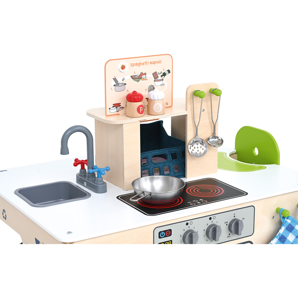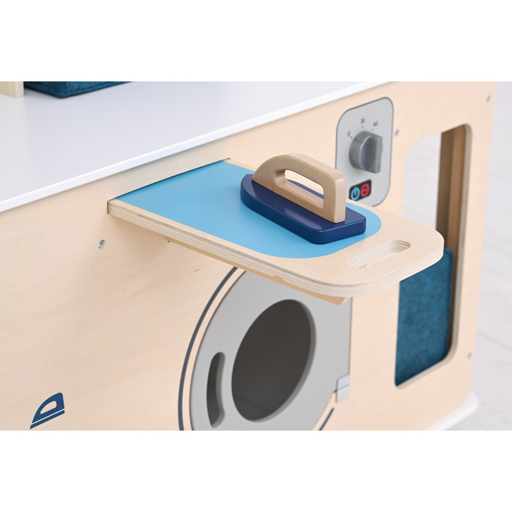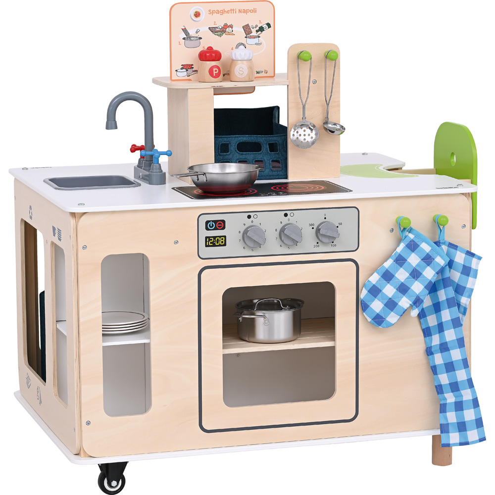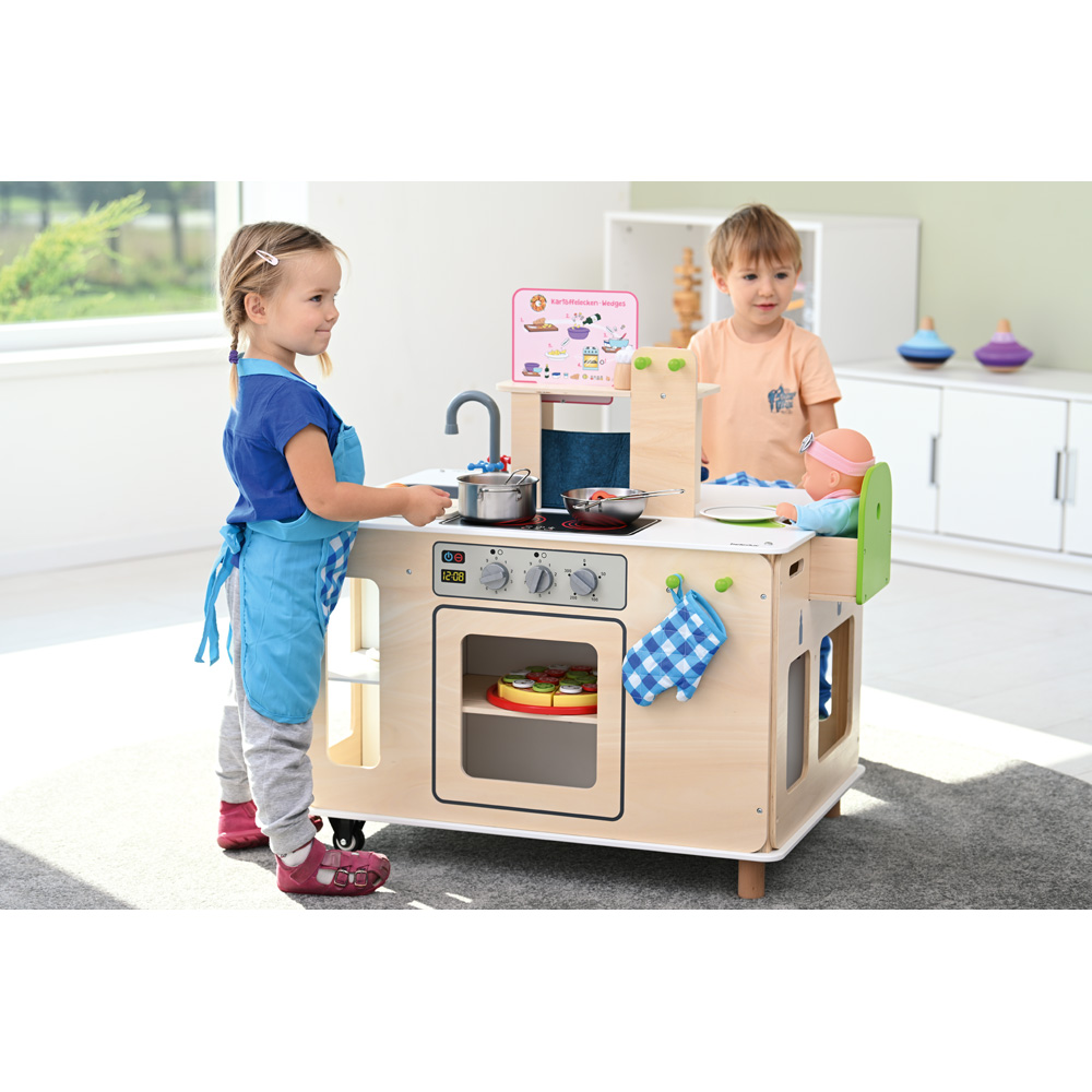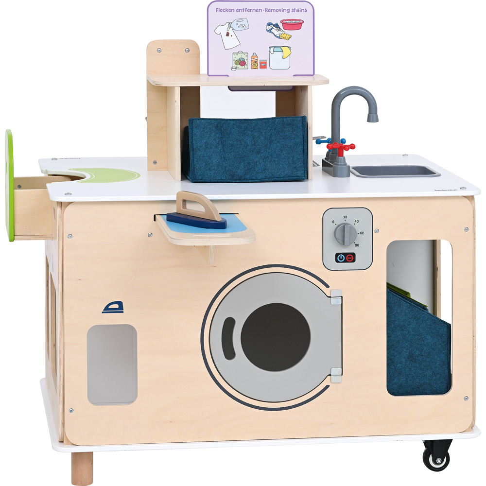 Kochen, Waschen, Bügeln und vieles mehr kann um die Kücheninsel herum erledigt werden. Auf jeder Seite gibt es etwas zu entdecken: Kochecke mit Herdplatten und Backofen. Auf den Rezeptkarten gibt es leckere Gerichte zum Nachkochen. Auf dem herausziehbaren Hochstuhl findet die Puppe Platz. Sie können dann zuschauen, wie der Puppenpapa bügelt. Am Waschbecken wird Staub das Geschirr gespült und der Müll kommt gleich in den passenden Mülleimer. In der integrierten Waschmaschine läuft gerade eine Waschladung und Tipps zum Wachen gibt es auch gleich. Hier sind der Kreativität keine Grenzen gesetzt und mehrere Kinder können zusammen spielen!