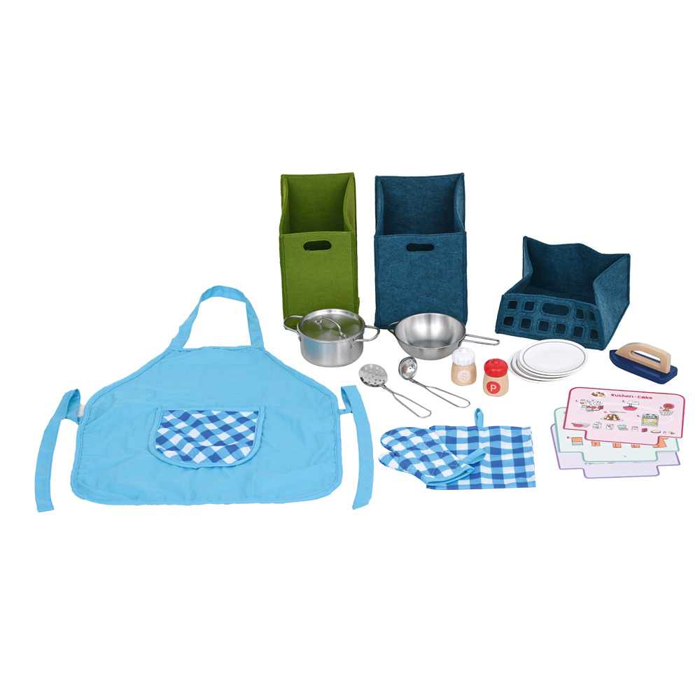 • diverses Zubehör (3 Rezeptkarten, 3 Wäsche-Tipp-Karten, 1 Schürze, 1 Topfhandschuh, 1 Geschirrtuch, 1 Wäschekorb, 1 Bügeleisen, 1 Topf, 1 Pfanne, 1 Kelle mit Durchschlag, 1 Suppenkelle, 4 Teller, Salz- und Pfefferstreuer, 2 Mülleimer aus Filz