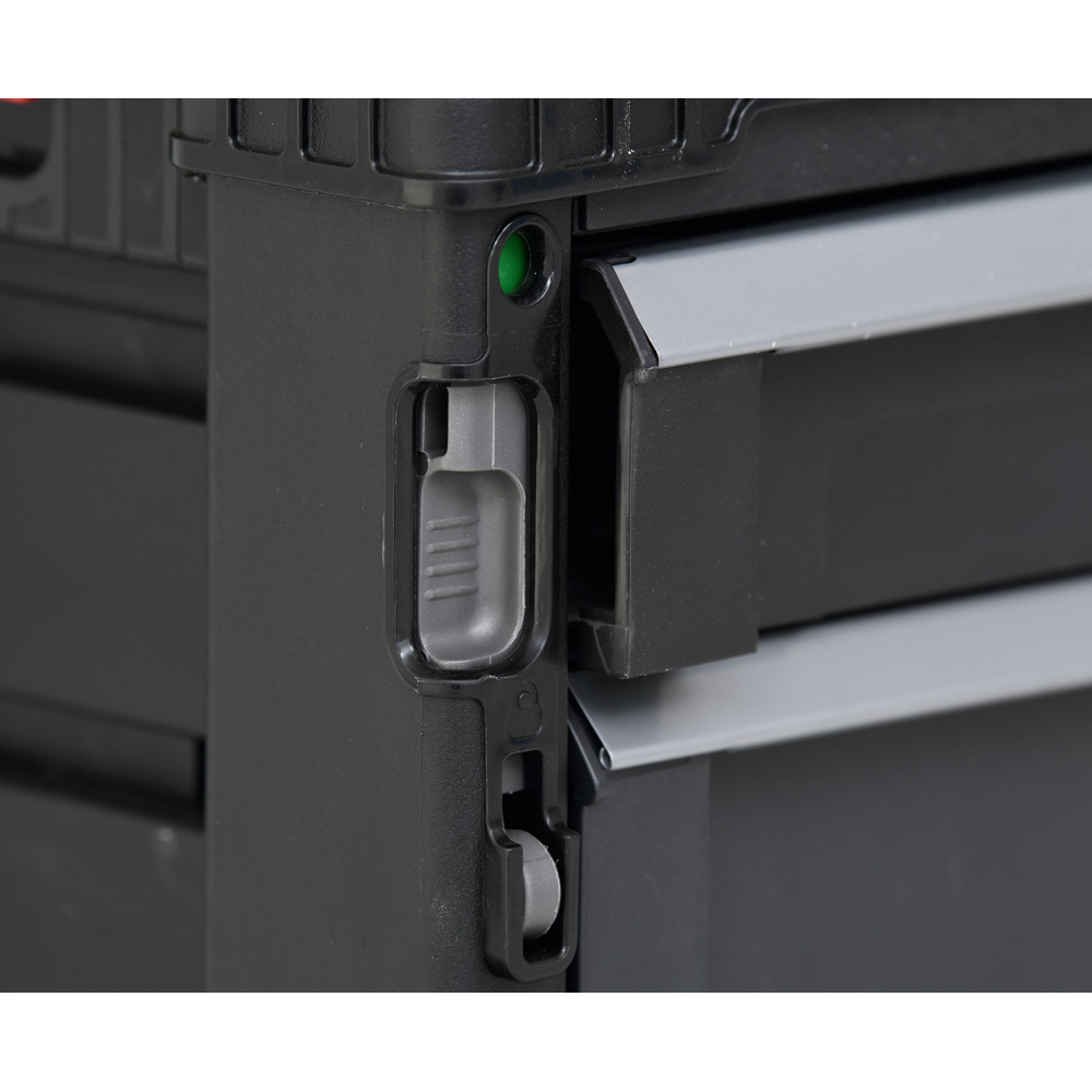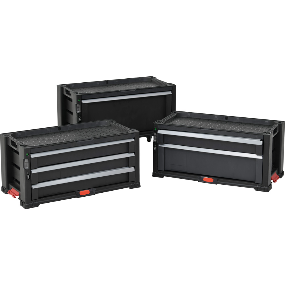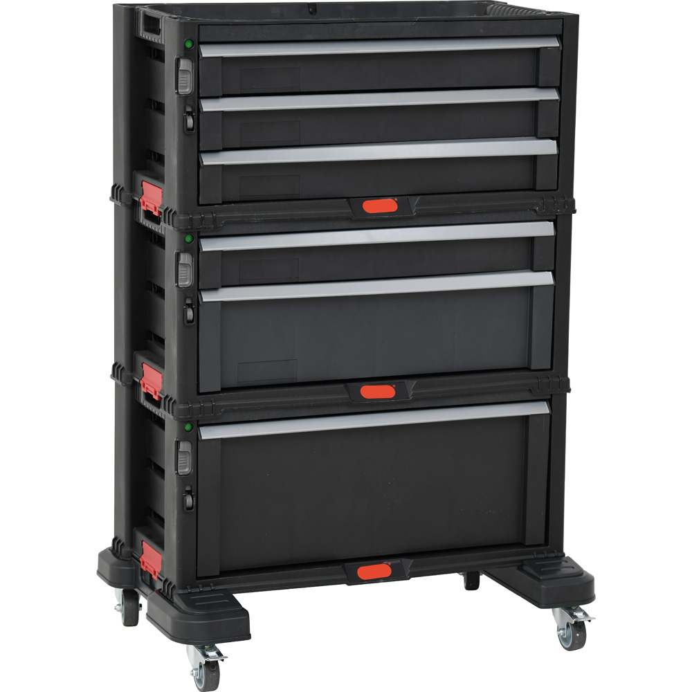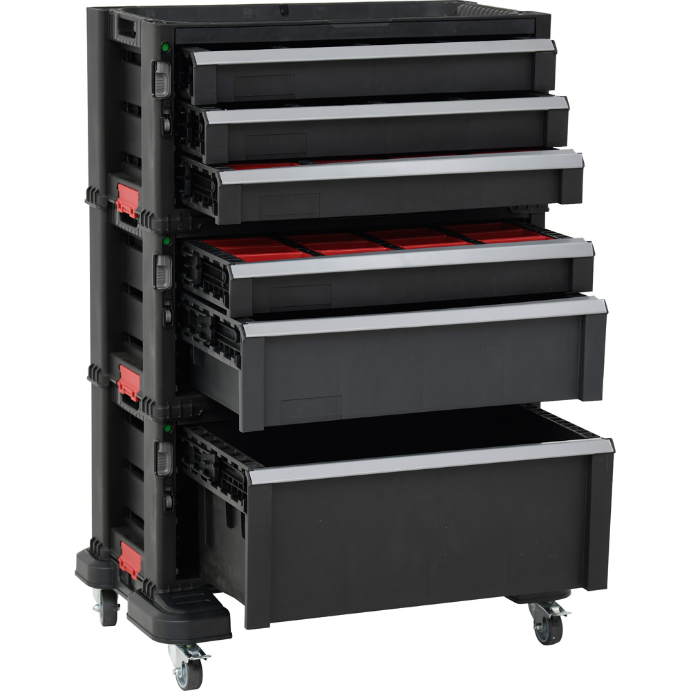 Bestehend aus 3 übereinander gestapelten Segmenten und Rollenuntersatz. Schubladen mit Fächereinteilung sorgen für perfekte Ordnung. Inkl. 16 Behälter für kleine Utensilien wie Schrauben, Muttern oder Scheiben.