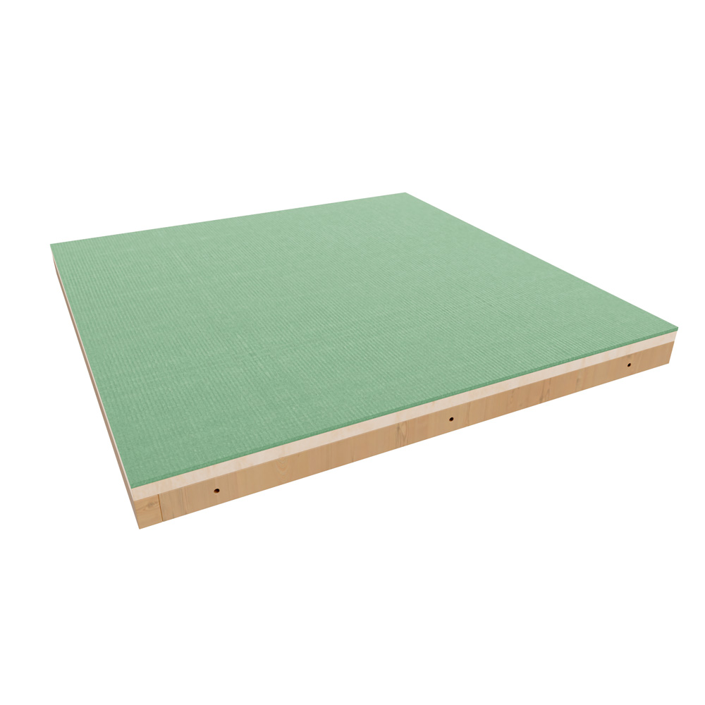 Podest für die Modulare Spielecke ModuPlay, mit rutschfestem tretford-Teppichboden. Kurze Verbindungsstücke verbinden zwei Podeste in Reihe, mit langen Verbindungsstücken schaffen Sie ein 2x2-Feld ohne Mittelpfosten für grosse Spielbereiche.