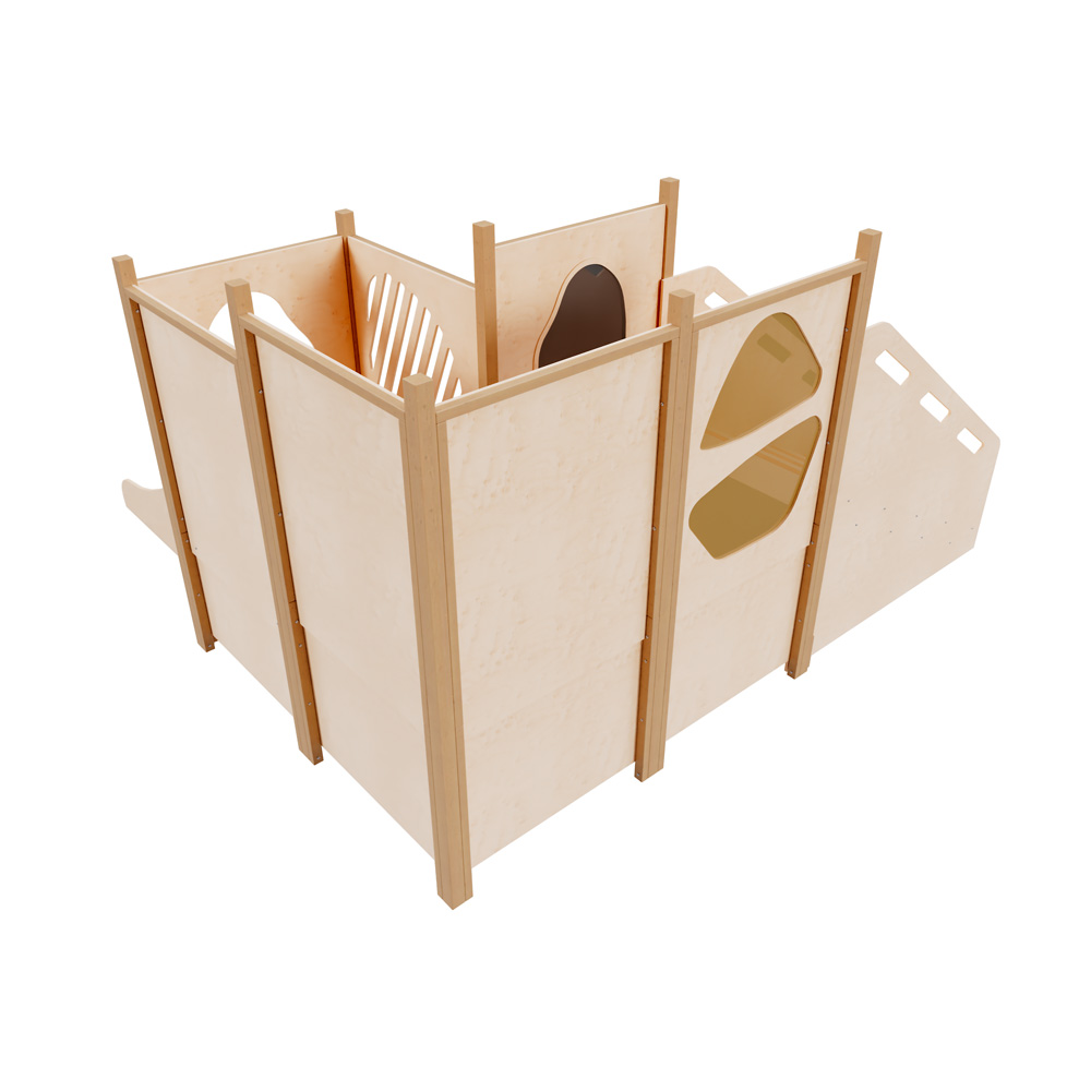 Wandelemente für ModuPlay-Spielecken, aus Sperrholz (Stärke: 12 mm) mit Montageleiste aus Erlenholz. Verschiedene Wände zur Auswahl, z.B. ohne Applikationen, mit farbigen Acryl-Fenstern, mit Aussparungen, mit sensorischen Elementen oder Motorik-Spielen.