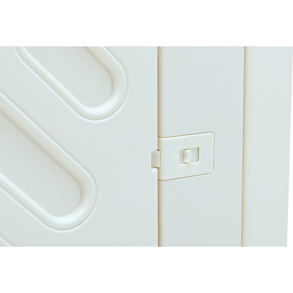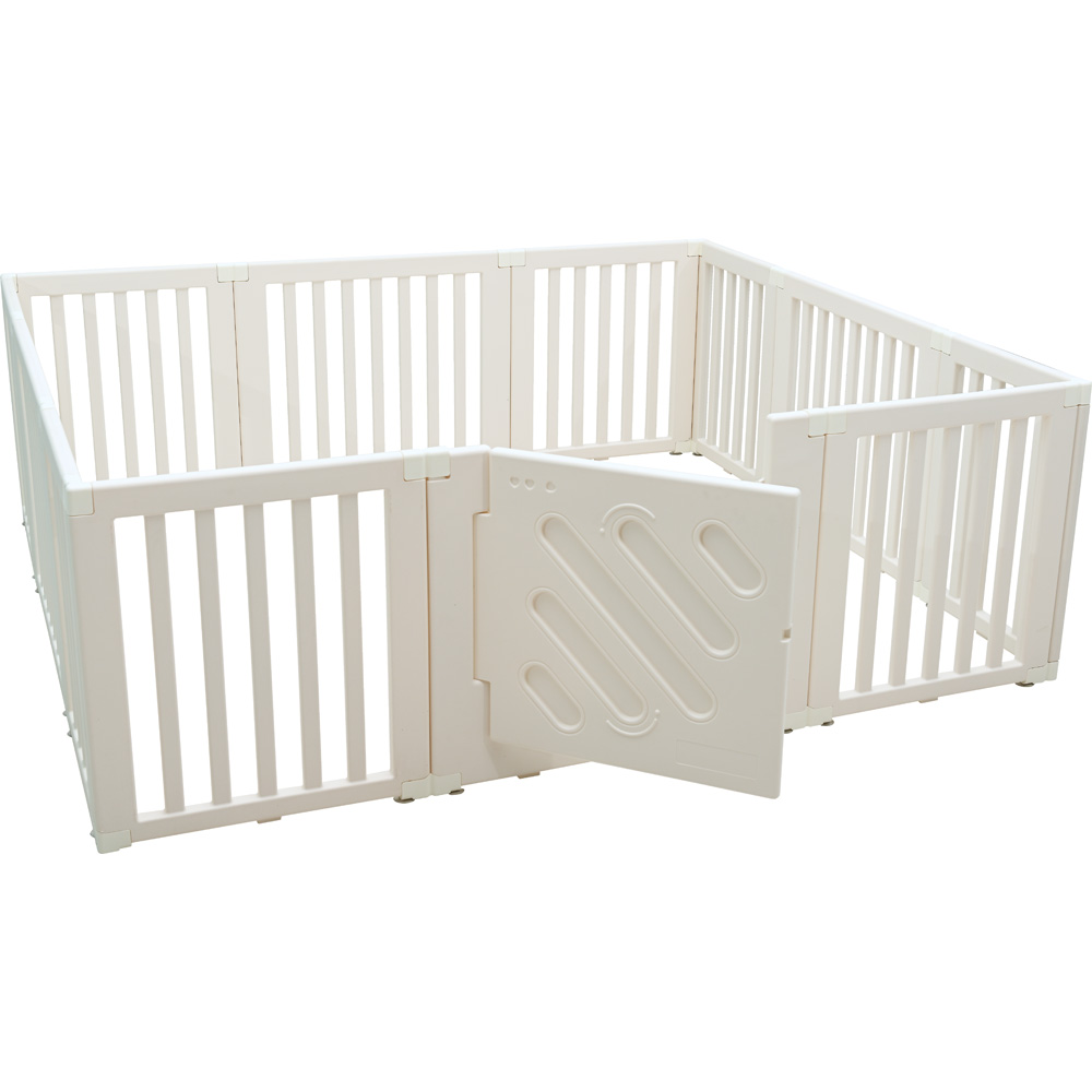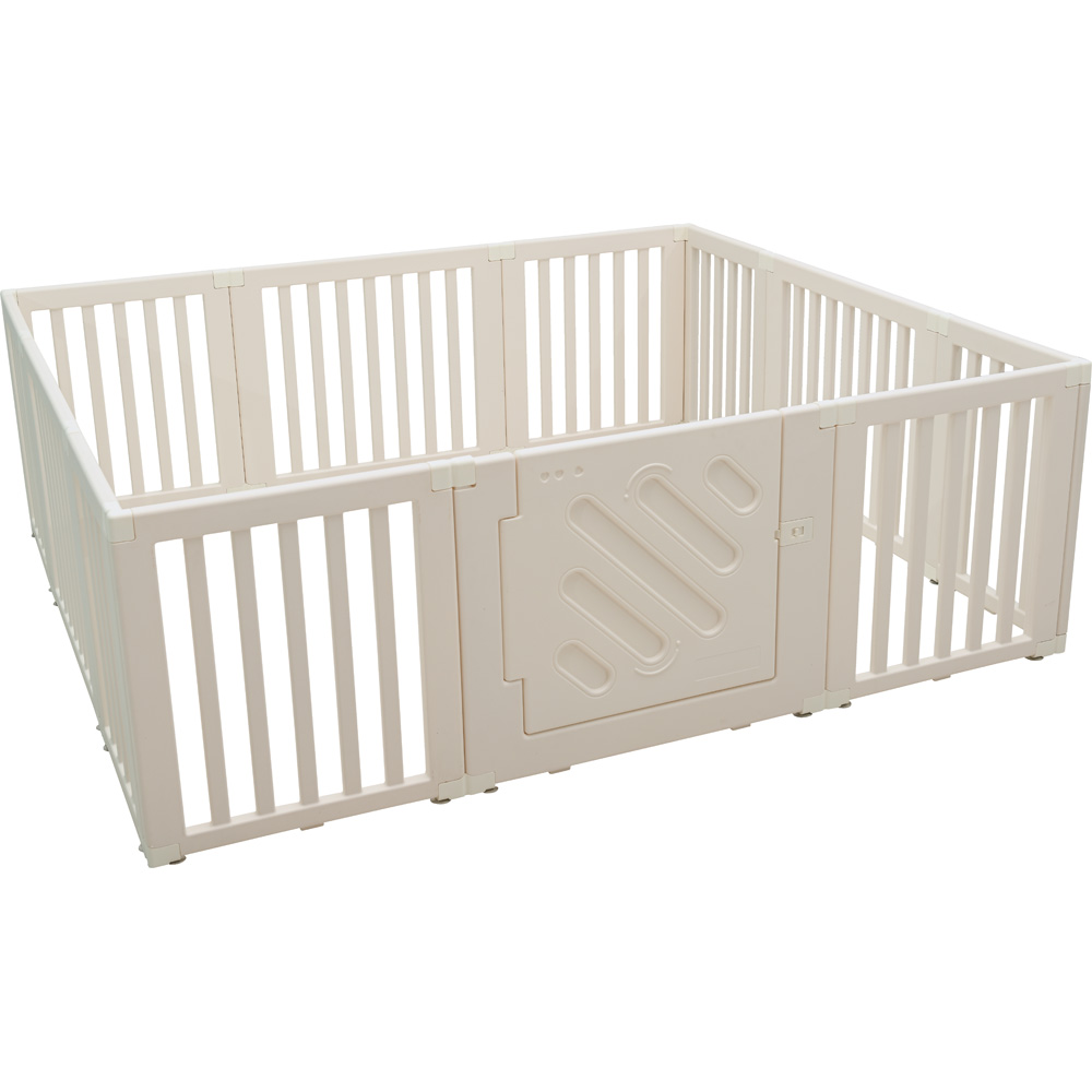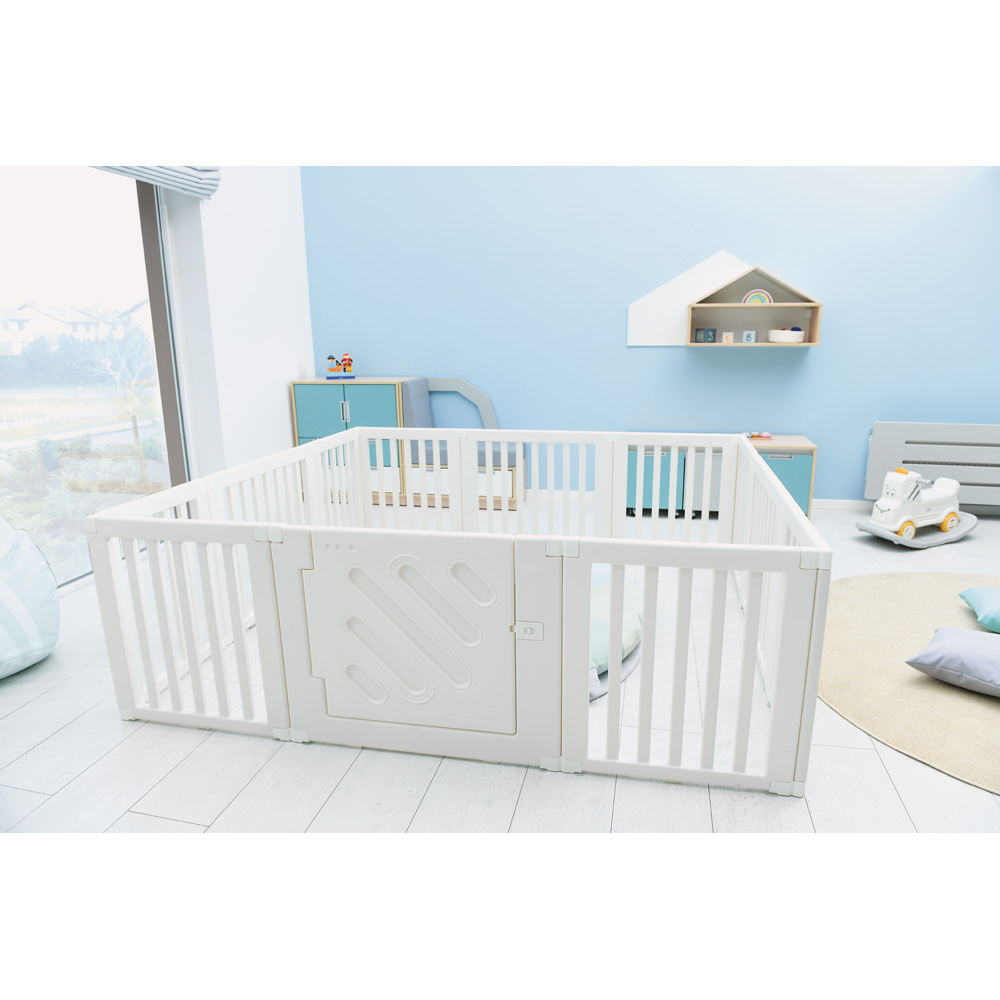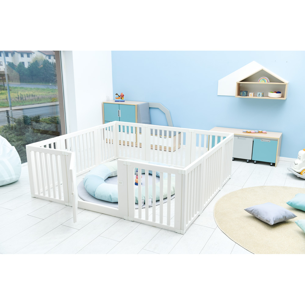 Die 12 Module lassen sich einfach zu einem Laufgitter mit Tür zusammenbauen. Klemmen stabilisieren die Verbindung zwischen den Modulen. Keine Befestigung an Boden oder Wand vorgesehen. Die sehr leichten Module lassen sich einfach ab- und an einem anderen Ort wieder aufbauen. Durch Verbinden mehrerer Sets kann eine grössere Spielfläche abgegrenzt werden, für eine kleinere Fläche einfach einzelne Module weglassen. Das Produkt kann kurzzeitig im Aussenbereich verwendet werden, sollte dort aber nicht über längere Zeit gelagert werden. Es ist einfach auseinanderzunehmen und platzsparend zu verstauen.