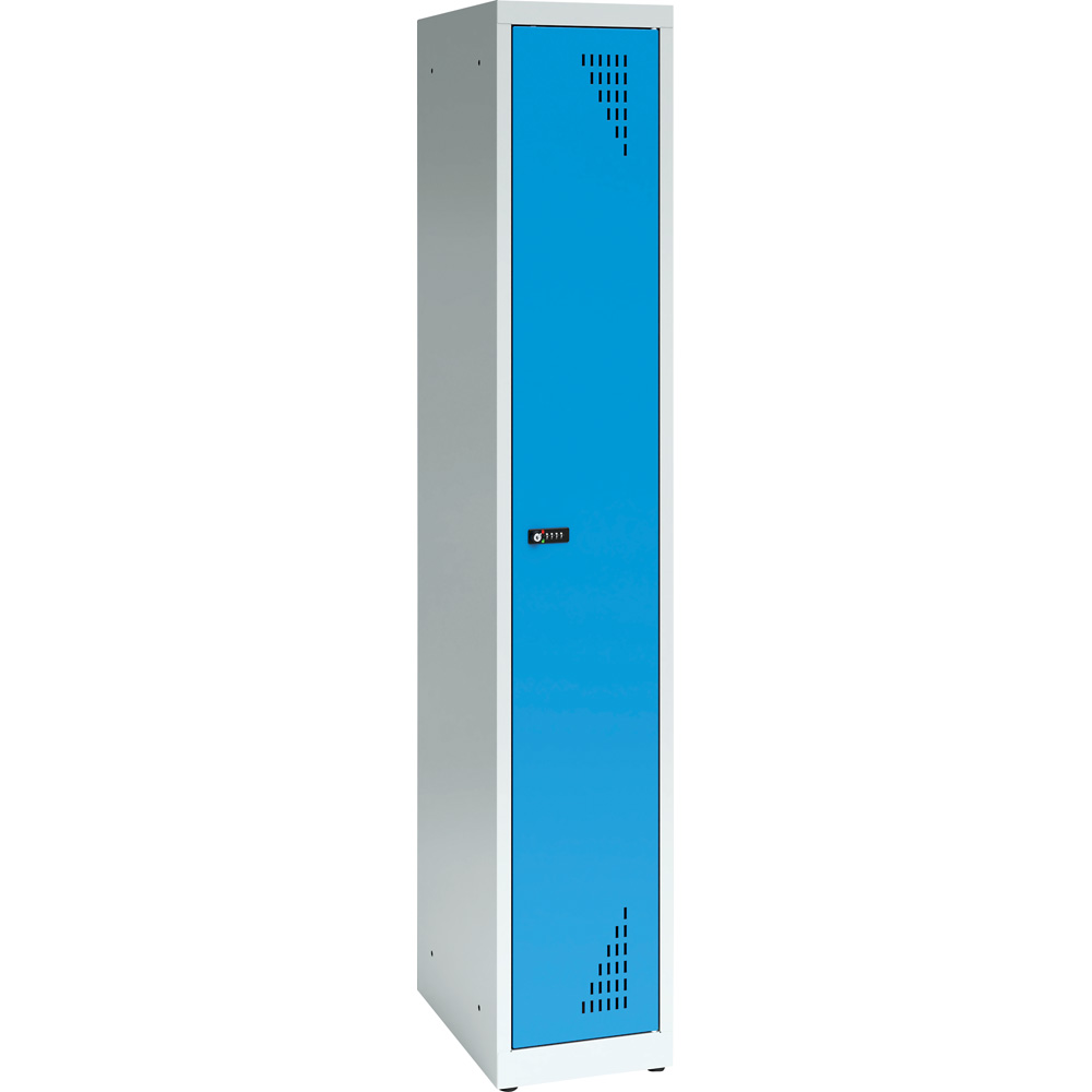 Stabiler Metallspind aus Stahlblech, verschweisst. Jedes Modul verfügt über eine Kleiderstange und 2 Kleiderhaken. Jedes Fach mit einem Zahlenschloss - kein Schlüsel benötigt. Mit Lüftungsschlitzen in den Türen und Platz für Namensschilder.
