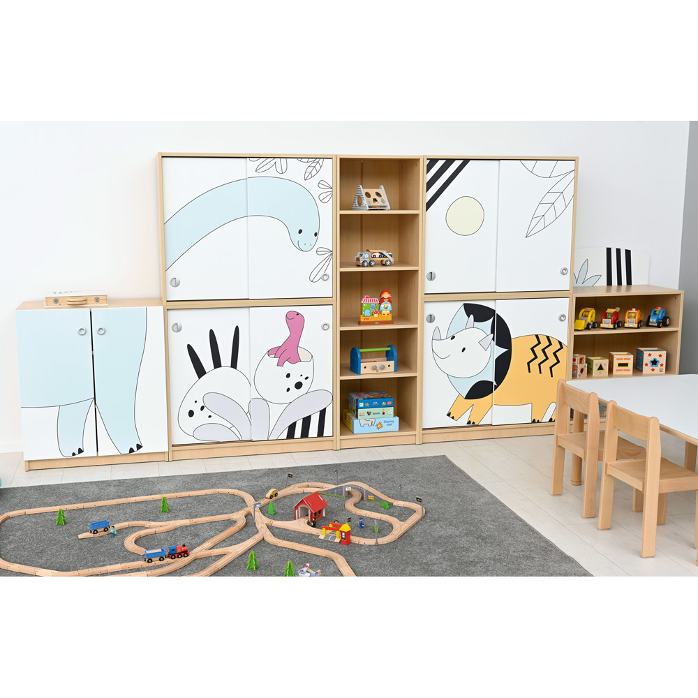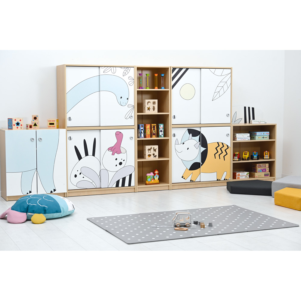 Die Möbelkollektion Phantasiewelt schafft eine freundliche Atmosphäre in Gruppenräumen. Ihre funktionalen Möbel bieten viel Raum zur Aufbewahrung von Lern- und Spielmaterialien, sowohl in den Schränken, als auch in den offenen Regalen. Die kinderfreundlichen phantasievollen Motive an den Schrankfronten stellen lustige Wald- und Haustiere dar. Schrankfronten aus laminierter MDF-Platte mit aufgedruckten Bildern, Korpus in Birke Dekor. Mit Schwenk- oder Schiebetüren. Die Schränke sind sowohl im Set, als auch einzeln erhältlich.