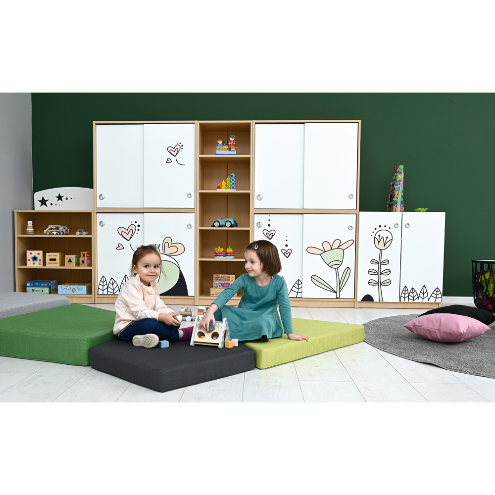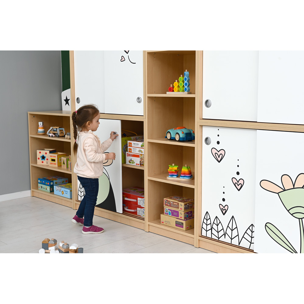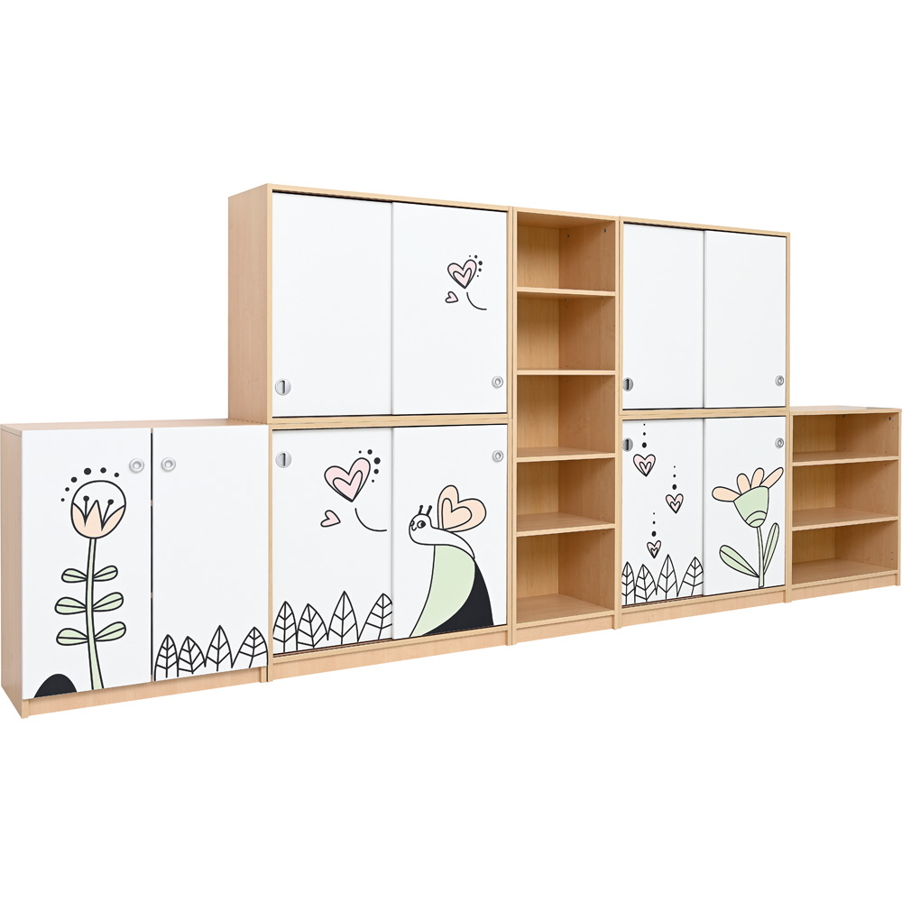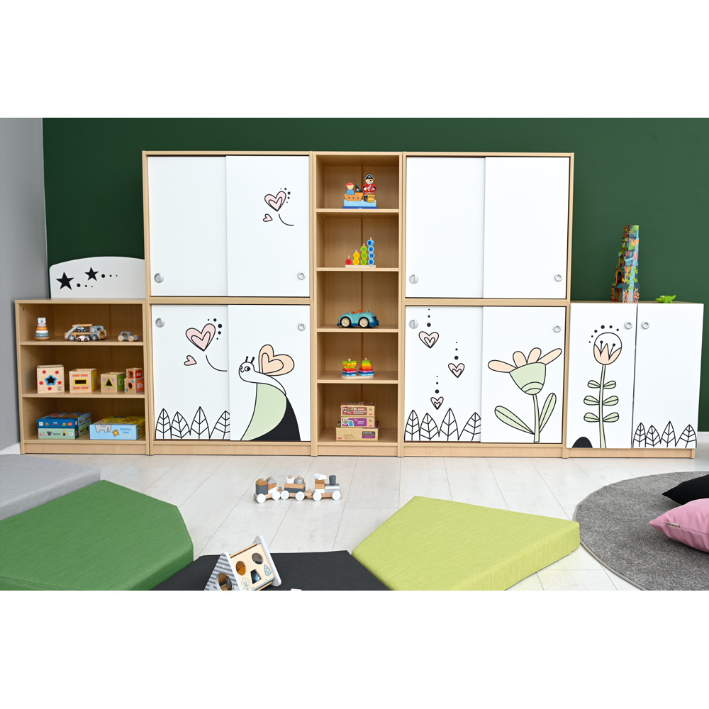 Die Möbelkollektion Phantasiewelt schafft eine freundliche Atmosphäre in Gruppenräumen. Ihre funktionalen Möbel bieten viel Raum zur Aufbewahrung von Lern- und Spielmaterialien, sowohl in den Schränken, als auch in den offenen Regalen. Die kinderfreundlichen phantasievollen Motive an den Schrankfronten stellen lustige Wald- und Haustiere dar. Schrankfronten aus laminierter MDF-Platte mit aufgedruckten Bildern, Korpus in Birke Dekor. Mit Schwenk- oder Schiebetüren. Die Schränke sind sowohl im Set, als auch einzeln erhältlich.