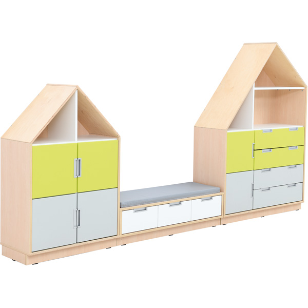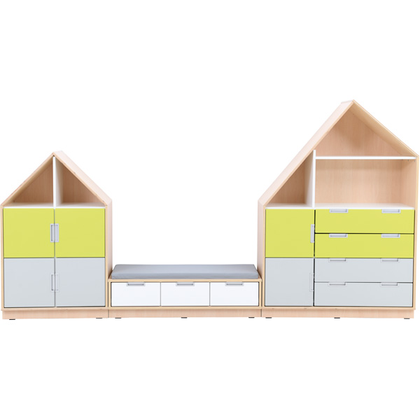 Für unsere Kollektion verwenden wir laminierte Spanplatte – für den Korpus wahlweise in Ahorn-Dekor oder Weiss, Trennwände und Einlegeböden sind stets weiss. Das natürliche Dekor kann mit Fronten aus farbig folierter MDF-Platte (Stärke 18 mm) ergänzt werden. Schubladen und Türen verfügen über Muschelgriffe, alufarben.