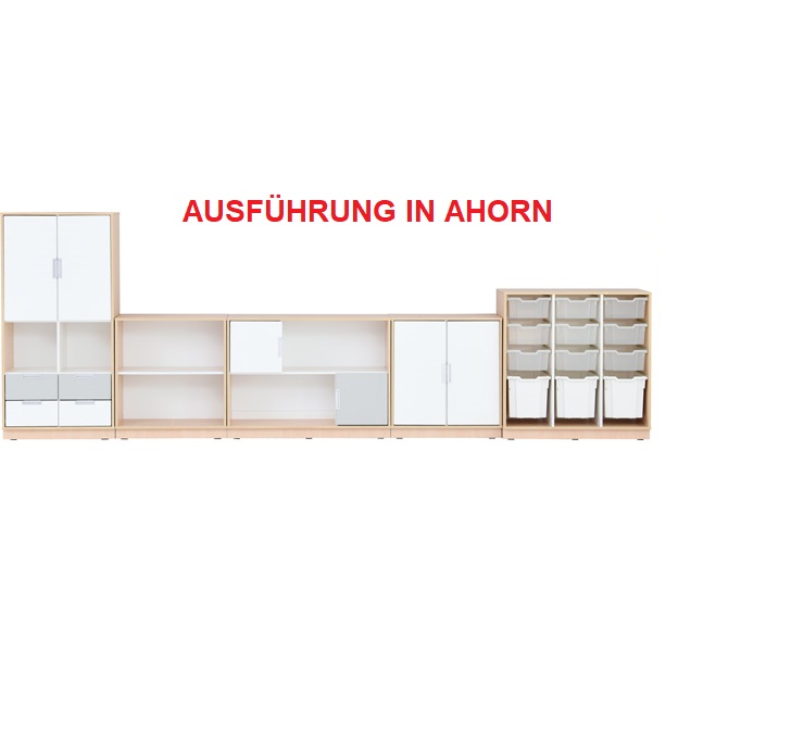 Für unsere Kollektion verwenden wir laminierte Spanplatte – für den Korpus wahlweise in Ahorn-Dekor oder Weiss, Trennwände und Einlegeböden sind stets weiss. Das natürliche Dekor kann mit Fronten aus farbig folierter MDF-Platte (Stärke 18 mm) ergänzt werden. Schubladen und Türen verfügen über Muschelgriffe, alufarben.