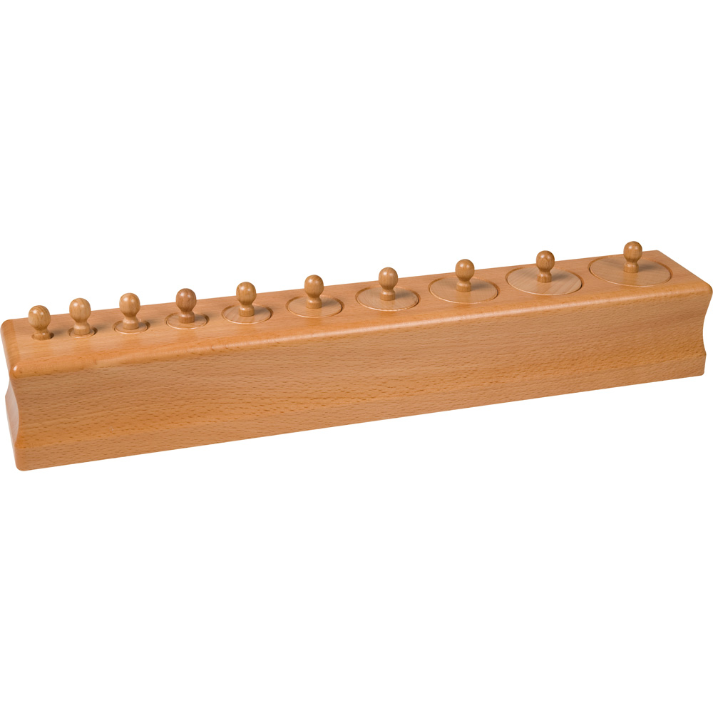 Basismaterial im Bereich Grössenwahrnehmung. In einen Holzblock sind verschieden hohe und/oder dicke Zylinder einzusortieren. Jeder der vier Holzblöcke stellt die Kinder vor eine andere Aufgabe: unterschiedliche Höhe bei gleichem Durchmesser, unterschiedlicher Durchmesser bei gleicher Höhe, zunehmender Durchmesser bei steigender Höhe, abnehmender Durchmesser bei steigender Höhe. Gleichzeitig schulen die Kinder ihre Feinmotorik. Zylinder mit handlichen Knopfgriffen.