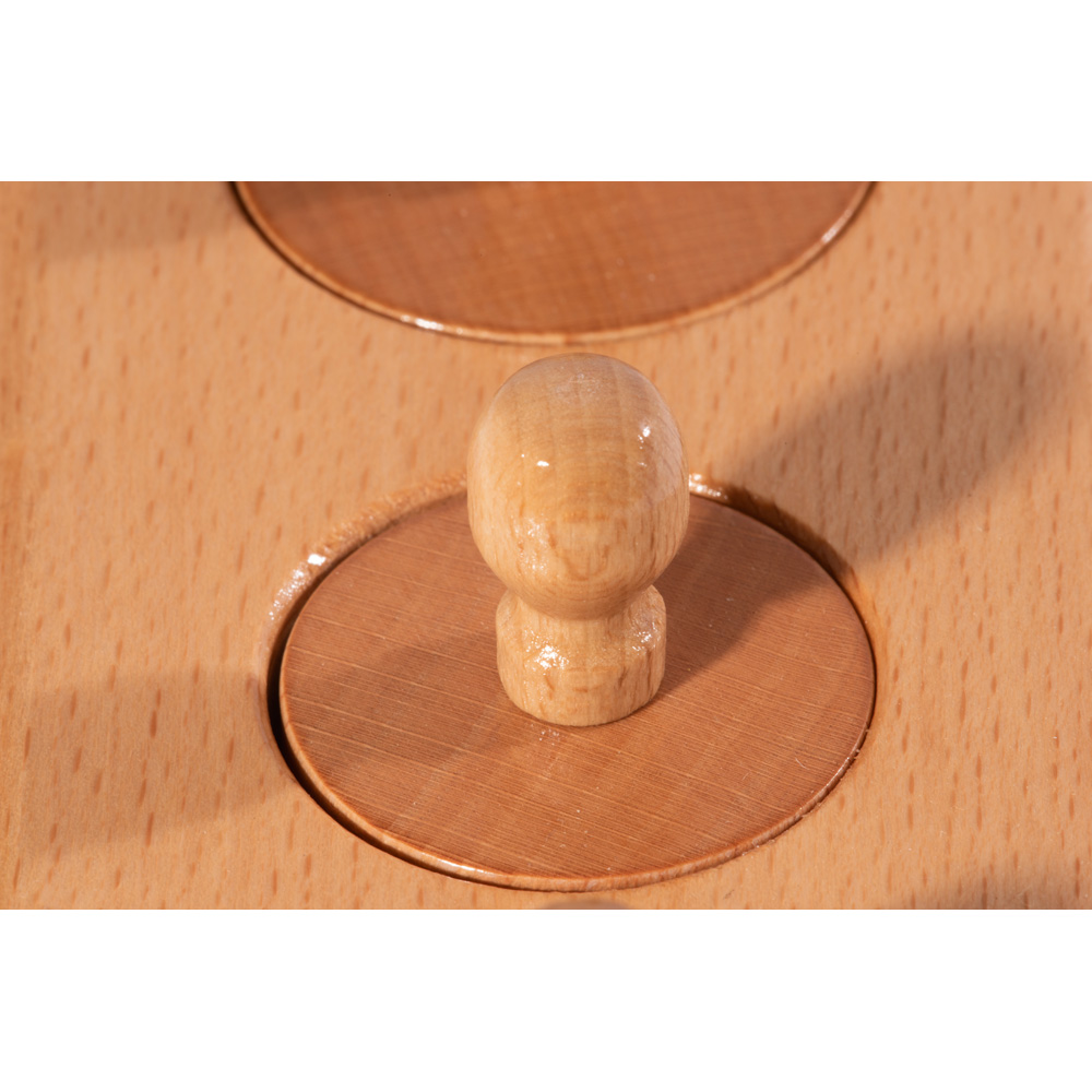 Basismaterial im Bereich Grössenwahrnehmung. In einen Holzblock sind verschieden hohe und/oder dicke Zylinder einzusortieren. Jeder der vier Holzblöcke stellt die Kinder vor eine andere Aufgabe: unterschiedliche Höhe bei gleichem Durchmesser, unterschiedlicher Durchmesser bei gleicher Höhe, zunehmender Durchmesser bei steigender Höhe, abnehmender Durchmesser bei steigender Höhe. Gleichzeitig schulen die Kinder ihre Feinmotorik. Zylinder mit handlichen Knopfgriffen.