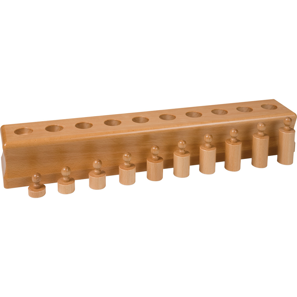 Basismaterial im Bereich Grössenwahrnehmung. In einen Holzblock sind verschieden hohe und/oder dicke Zylinder einzusortieren. Jeder der vier Holzblöcke stellt die Kinder vor eine andere Aufgabe: unterschiedliche Höhe bei gleichem Durchmesser, unterschiedlicher Durchmesser bei gleicher Höhe, zunehmender Durchmesser bei steigender Höhe, abnehmender Durchmesser bei steigender Höhe. Gleichzeitig schulen die Kinder ihre Feinmotorik. Zylinder mit handlichen Knopfgriffen.